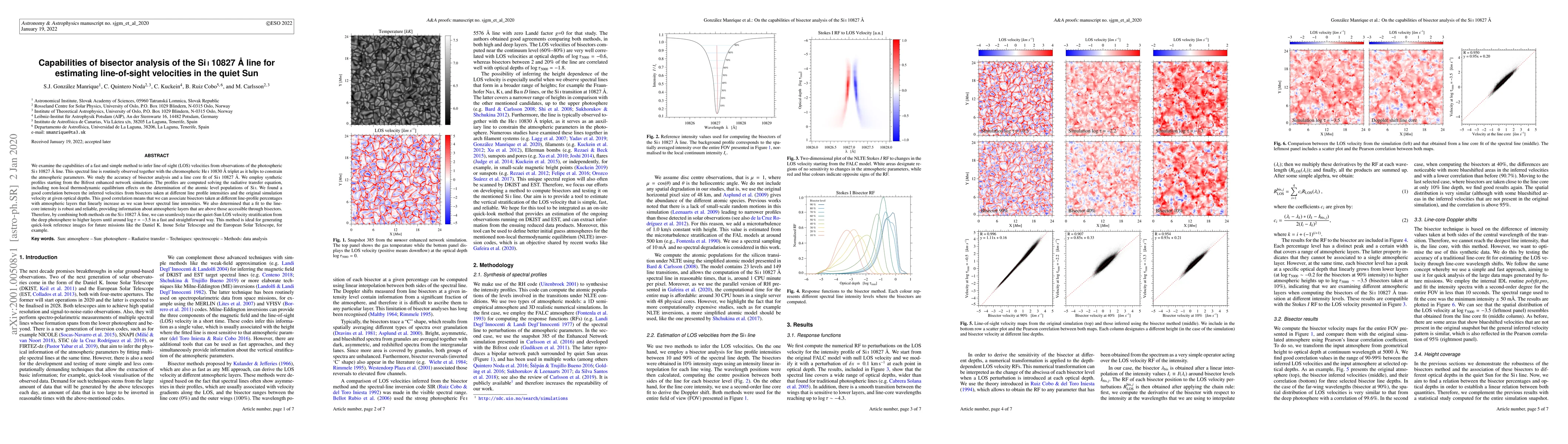 A new method for estimating line-of-sight velocities in the quiet Sun has been developed using bisector analysis of the Si I 10827 A spectral line, offering a fast and straightforward way to trace velocity stratification from the photosphere to higher layers.