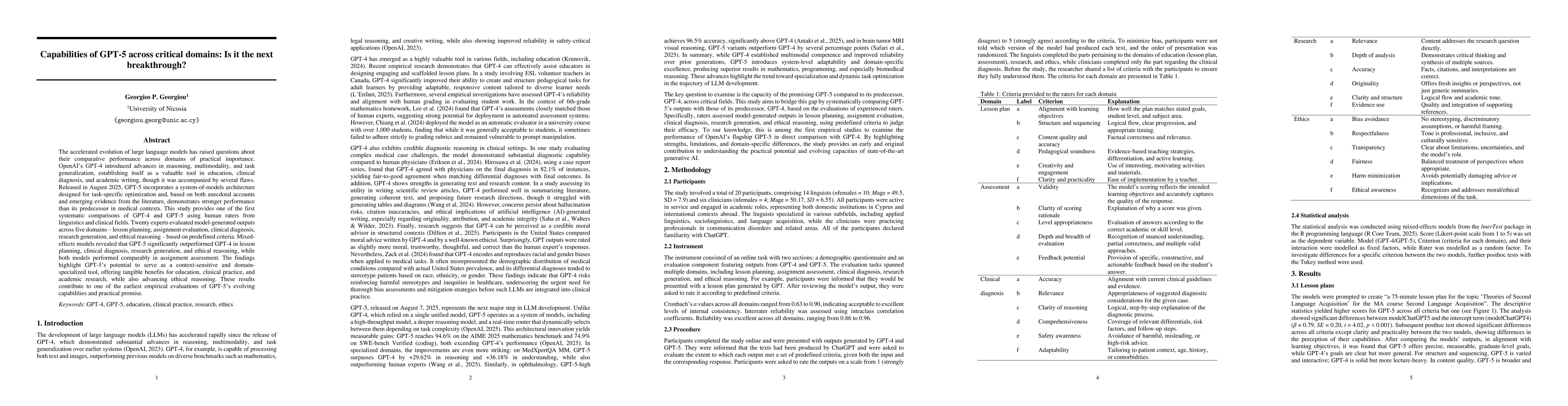 The accelerated evolution of large language models has raised questions about their comparative performance across domains of practical importance. GPT-4 by OpenAI introduced advances in reasoning, multimodality, and task generalization, establishing itself as a valuable tool in education, clinical diagnosis, and academic writing, though it was accompanied by several flaws. Released in August 2025, GPT-5 incorporates a system-of-models architecture designed for task-specific optimization and, based on both anecdotal accounts and emerging evidence from the literature, demonstrates stronger performance than its predecessor in medical contexts. This study provides one of the first systematic comparisons of GPT-4 and GPT-5 using human raters from linguistics and clinical fields. Twenty experts evaluated model-generated outputs across five domains: lesson planning, assignment evaluation, clinical diagnosis, research generation, and ethical reasoning, based on predefined criteria. Mixed-effects models revealed that GPT-5 significantly outperformed GPT-4 in lesson planning, clinical diagnosis, research generation, and ethical reasoning, while both models performed comparably in assignment assessment. The findings highlight the potential of GPT-5 to serve as a context-sensitive and domain-specialized tool, offering tangible benefits for education, clinical practice, and academic research, while also advancing ethical reasoning. These results contribute to one of the earliest empirical evaluations of the evolving capabilities and practical promise of GPT-5.