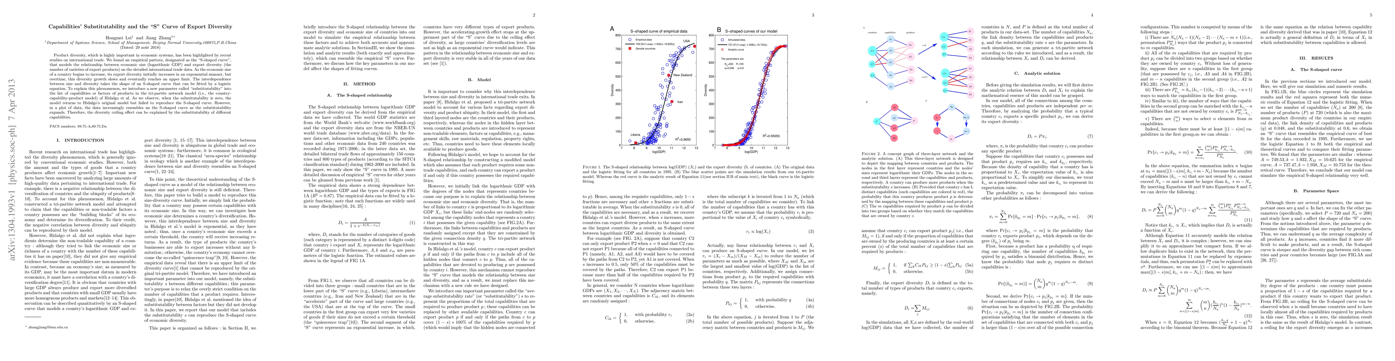Product diversity, which is highly important in economic systems, has been highlighted by recent studies on international trade. We found an empirical pattern, designated as the "S-shaped curve", that models the relationship between economic size (logarithmic GDP) and export diversity (the number of varieties of export products) on the detailed international trade data. As the economic size of a country begins to increase, its export diversity initially increases in an exponential manner, but overtime, this diversity growth slows and eventually reaches an upper limit. The interdependence between size and diversity takes the shape of an S-shaped curve that an be fitted by a logistic equation. To explain this phenomenon, we introduce a new parameter called "substitutability" into the list of capabilities or factors of products in the tri-partite network model (i.e., the country-capability-product model) of Hidalgo et al. As we observe, when the substitutability is zero, the model returns to Hidalgo's original model but failed to reproduce the S-shaped curve. However, in a plot of data, the data increasingly resembles an the S-shaped curve as the substitutability expands. Therefore, the diversity ceiling effect can be explained by the substitutability of different capabilities.