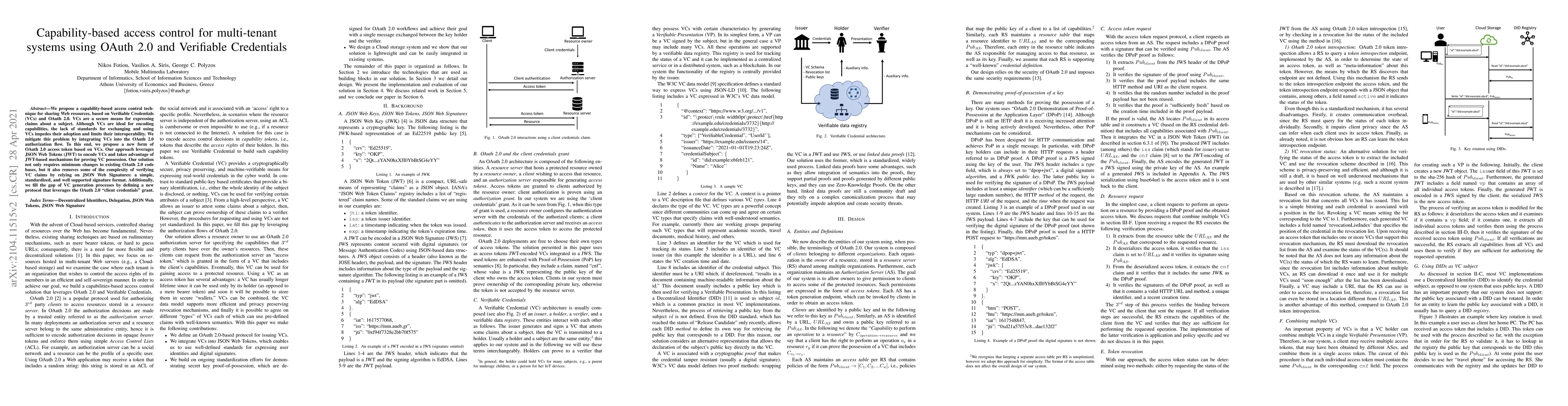 This paper proposes a capability-based access control method for multi-tenant systems using Verifiable Credentials (VCs) integrated into the OAuth 2.0 framework. It introduces a new OAuth 2.0 access token based on VCs, leveraging JSON Web Tokens (JWT) to enhance interoperability and simplify VC verification.
