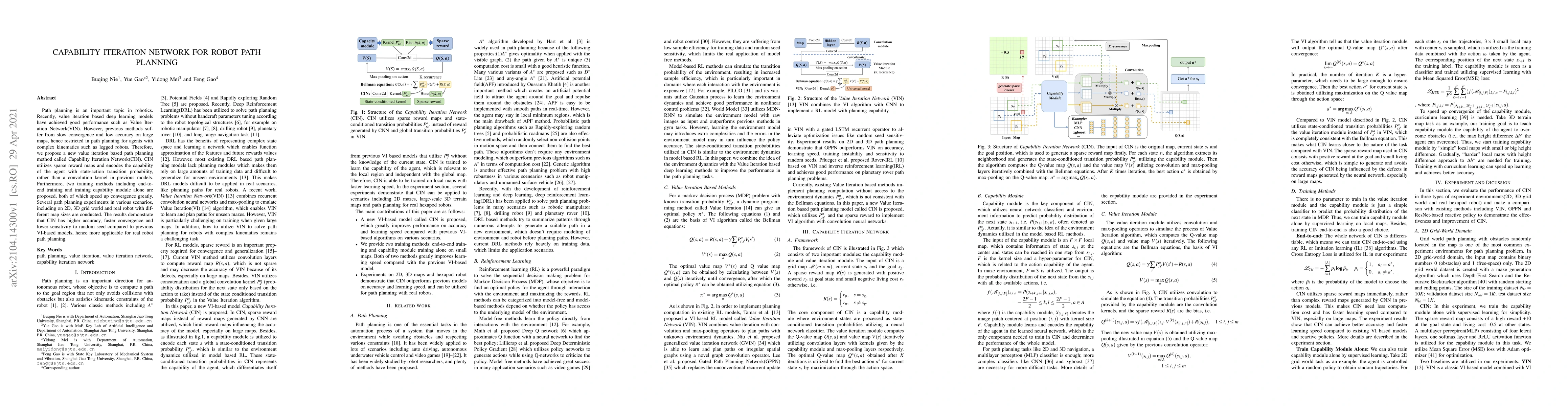Path planning is an important topic in robotics. Recently, value iteration based deep learning models have achieved good performance such as Value Iteration Network(VIN). However, previous methods suffer from slow convergence and low accuracy on large maps, hence restricted in path planning for agents with complex kinematics such as legged robots. Therefore, we propose a new value iteration based path planning method called Capability Iteration Network(CIN). CIN utilizes sparse reward maps and encodes the capability of the agent with state-action transition probability, rather than a convolution kernel in previous models. Furthermore, two training methods including end-to-end training and training capability module alone are proposed, both of which speed up convergence greatly. Several path planning experiments in various scenarios, including on 2D, 3D grid world and real robots with different map sizes are conducted. The results demonstrate that CIN has higher accuracy, faster convergence, and lower sensitivity to random seed compared to previous VI-based models, hence more applicable for real robot path planning.