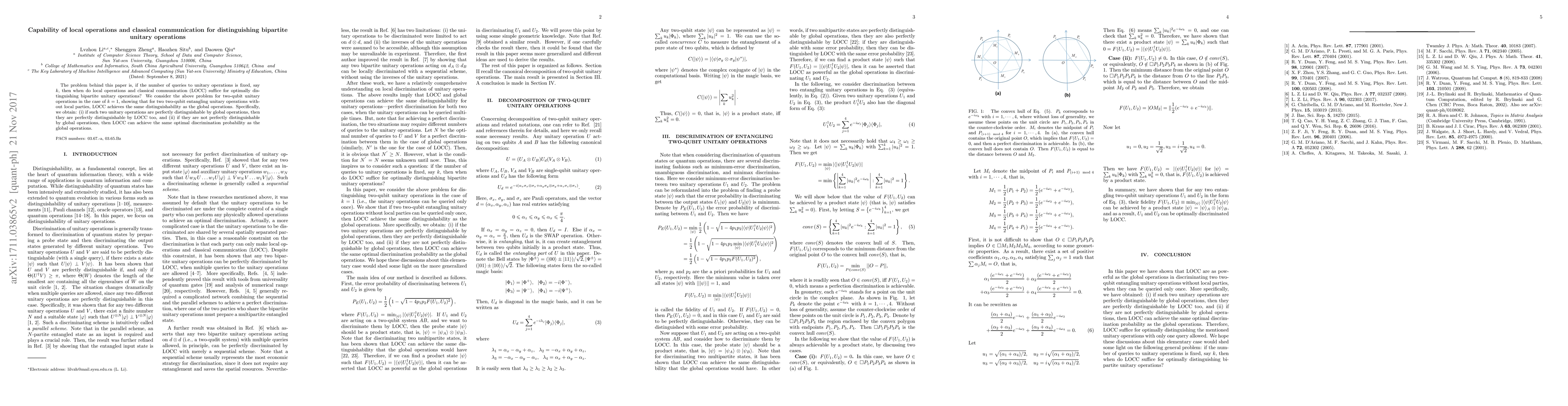 This paper investigates whether local operations and classical communication (LOCC) can optimally distinguish bipartite unitary operations when the number of queries is limited. For two-qubit unitary operations with $k=1$ query, it demonstrates that LOCC can achieve the same distinguishability as global operations, showing that LOCC can either perfectly distinguish or reach the same optimal discrimination probability as global operations.