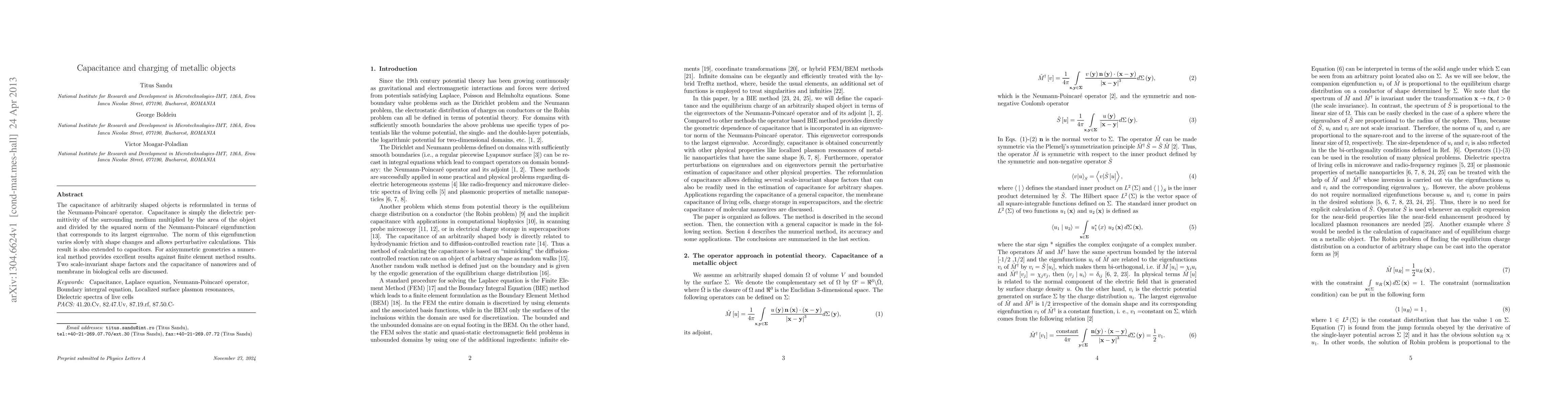 The capacitance of arbitrarily shaped objects is reformulated in terms of the Neumann-Poincar\'{e} operator. Capacitance is simply the dielectric permittivity of the surrounding medium multiplied by the area of the object and divided by the squared norm of the Neumann-Poincar\'{e} eigenfunction that corresponds to its largest eigenvalue. The norm of this eigenfunction varies slowly with shape changes and allows perturbative calculations. This result is also extended to capacitors. For axisymmetric geometries a numerical method provides excellent results against finite element method results. Two scale-invariant shape factors and the capacitance of nanowires and of membrane in biological cells are discussed.