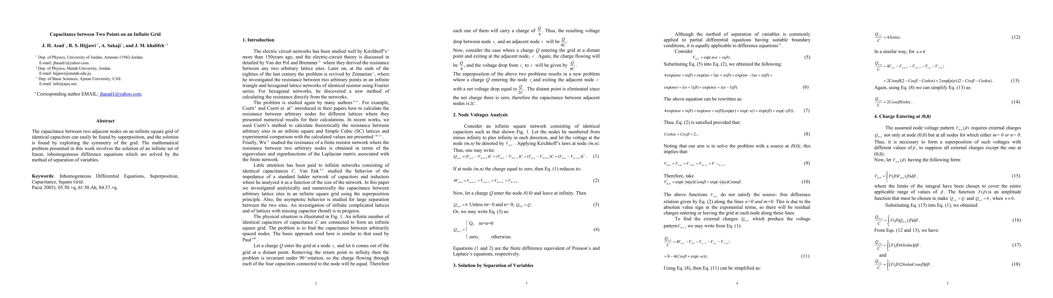 The capacitance between two adjacent nodes on an infinite square grid of identical capacitors can easily be found by superposition, and the solution is found by explotting the symmetry of the grid. The mathematical problem presented in this work involves the solution of an infinite set of linear, inhomogenous difference equations which are solved by the method of separation of variables.