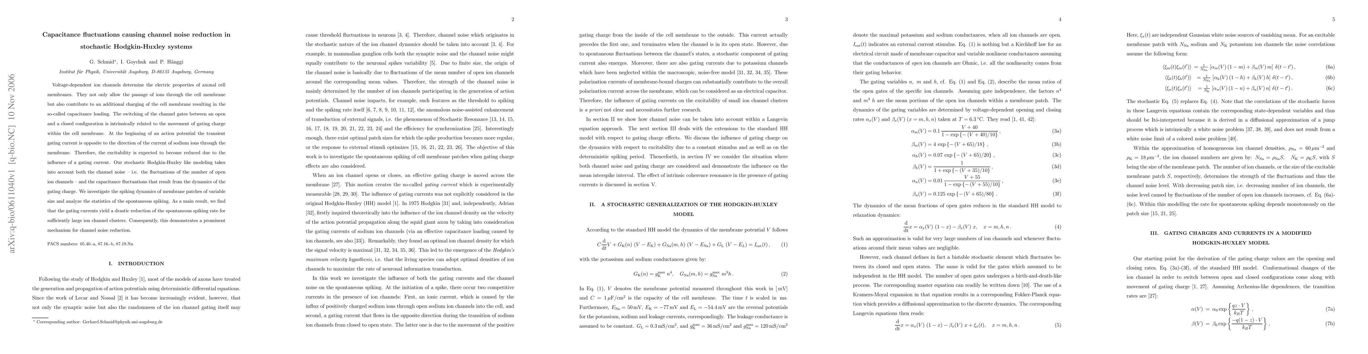 This paper investigates how capacitance fluctuations in stochastic Hodgkin-Huxley models affect the dynamics of voltage-dependent ion channels, finding that gating currents significantly reduce the spontaneous spiking rate in large ion channel clusters, thus demonstrating a key mechanism for channel noise reduction.