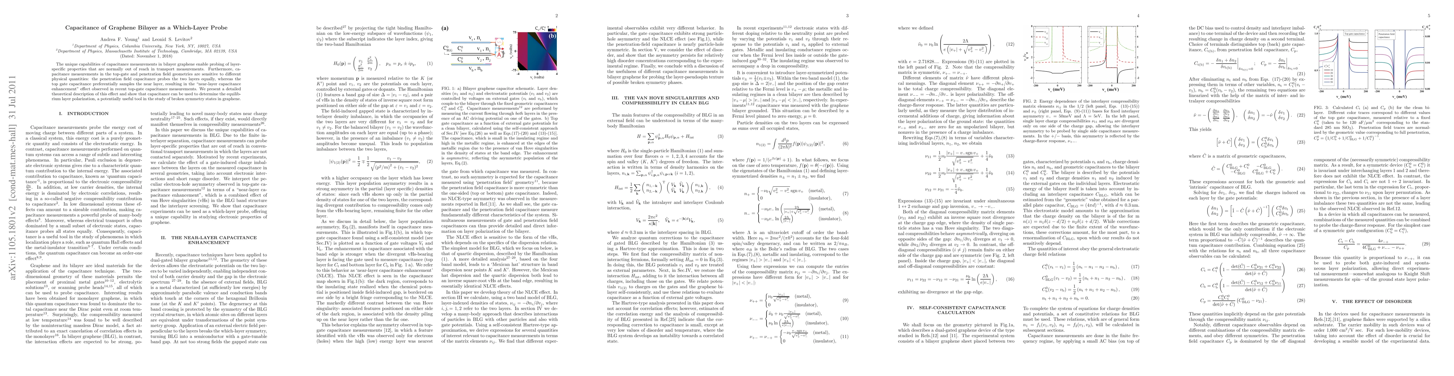 This paper explores the use of capacitance measurements in bilayer graphene to probe layer-specific properties, demonstrating that different geometries yield distinct physical insights. It highlights the "near-layer capacitance enhancement" effect in top-gate capacitance measurements and proposes a theoretical framework for utilizing capacitance to determine equilibrium layer polarization.