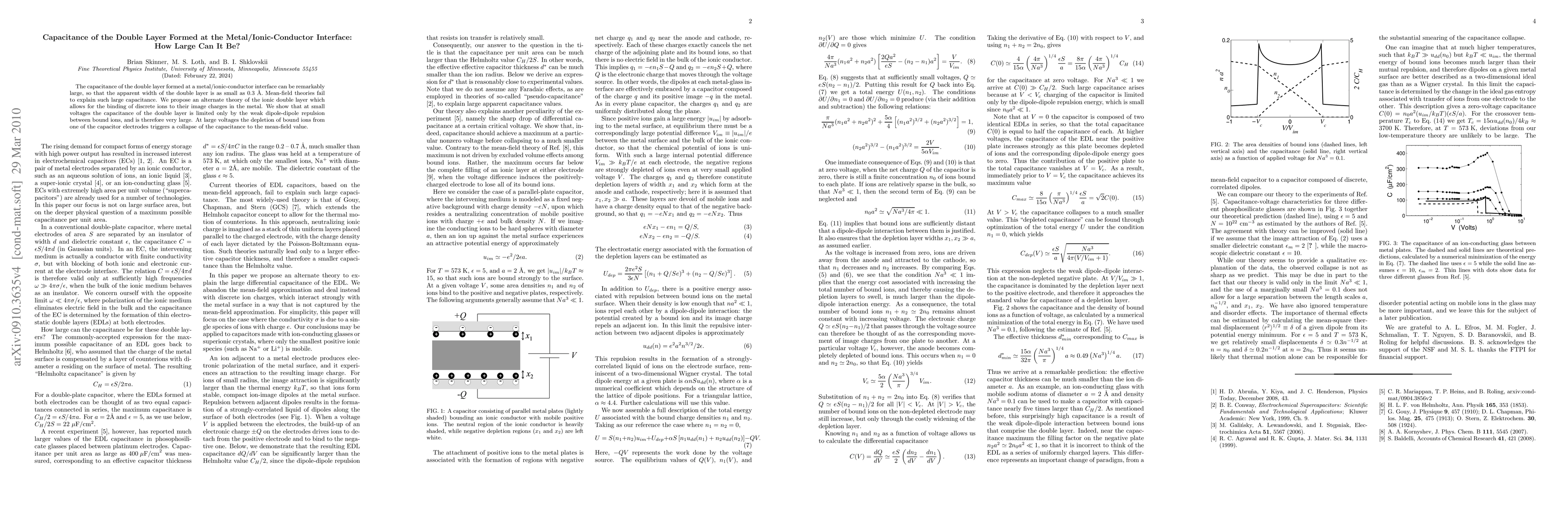 This paper explores the unexpectedly large capacitance of the double layer at metal/ionic-conductor interfaces, proposing a new theory that accounts for the binding of discrete ions to image charges in the metal. It demonstrates that the capacitance is limited by weak dipole-dipole repulsion at small voltages, but collapses to mean-field values at high voltages due to ion depletion.
