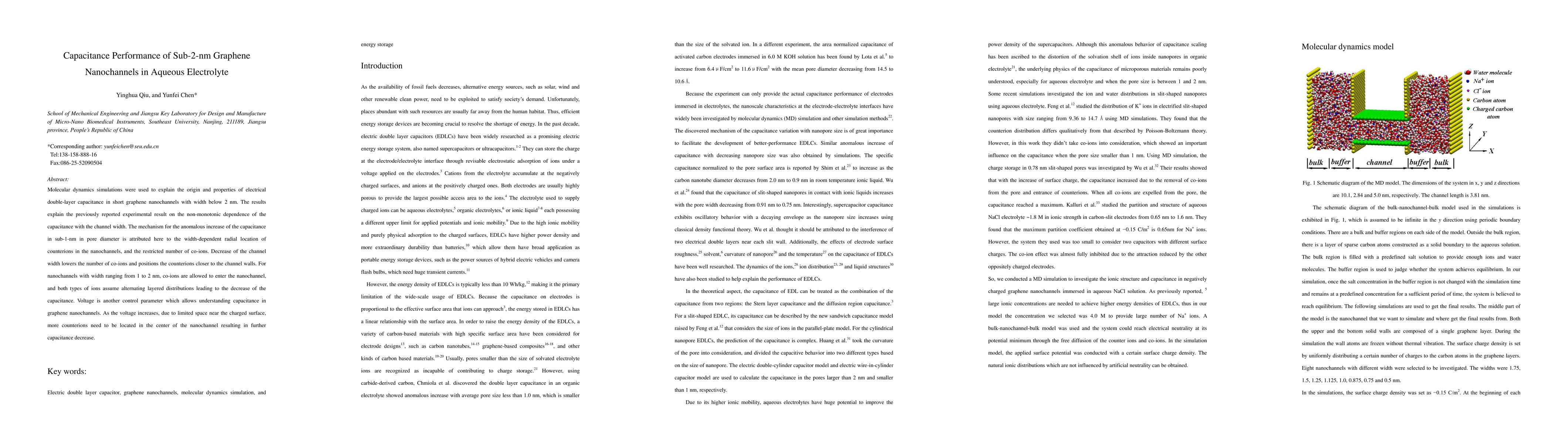 Molecular dynamics simulations were used to explain the origin and properties of electrical double-layer capacitance in short graphene nanochannels with width below 2 nm. The results explain the previously reported experimental result on the non-monotonic dependence of the capacitance with the channel width. The mechanism for the anomalous increase of the capacitance in sub-1-nm in pore diameter is attributed here to the width-dependent radial location of counterions in the nanochannels, and the restricted number of co-ions. Decrease of the channel width lowers the number of co-ions and positions the counterions closer to the channel walls. For nanochannels with width ranging from 1 to 2 nm, co-ions are allowed to enter the nanochannel, and both types of ions assume alternating layered distributions leading to the decrease of the capacitance. Voltage is another control parameter which allows understanding capacitance in graphene nanochannels. As the voltage increases, due to limited space near the charged surface, more counterions need to be located in the center of the nanochannel resulting in further capacitance decrease.