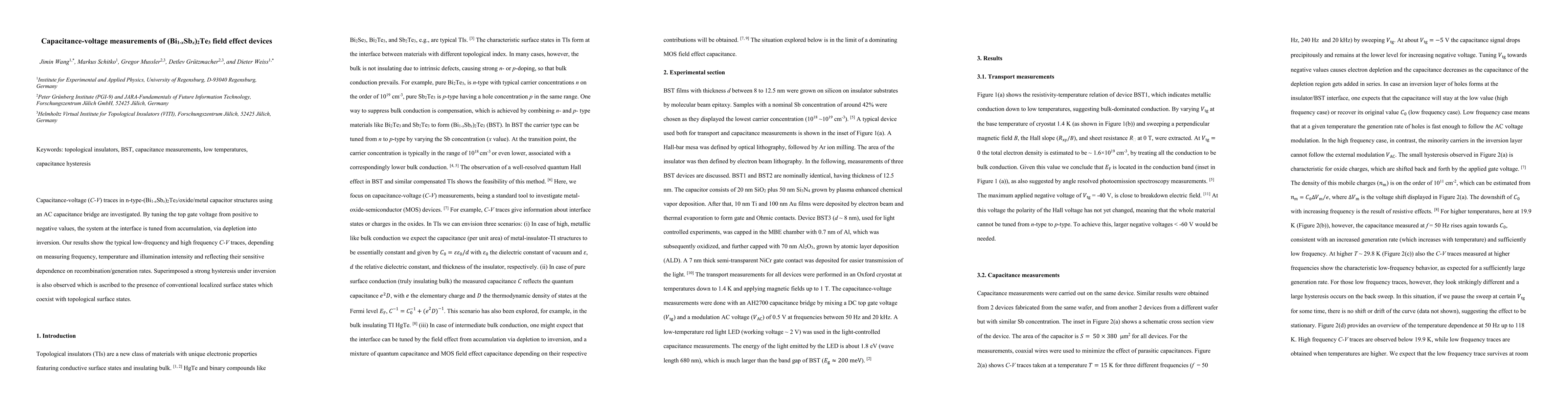 Capacitance-voltage ($\textit{C-V}$) traces in n-type-(Bi$_{1-x}$Sb$_x$)$_2$Te$_3$/oxide/metal capacitor structures using an AC capacitance bridge are investigated. By tuning the top gate voltage from positive to negative values, the system at the interface is tuned from accumulation, via depletion into inversion. Our results show the typical low-frequency and high frequency $\textit{C-V}$ traces, depending on measuring frequency, temperature and illumination intensity and reflecting their sensitive dependence on recombination/generation rates. Superimposed a strong hysteresis under inversion is also observed which is ascribed to the presence of conventional localized surface states which coexist with topological surface states.