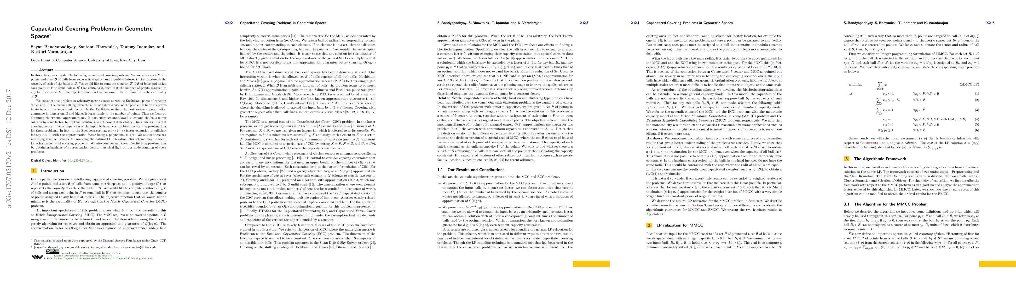 In this article, we consider the following capacitated covering problem. We are given a set $P$ of $n$ points and a set $\mathcal{B}$ of balls from some metric space, and a positive integer $U$ that represents the capacity of each of the balls in $\mathcal{B}$. We would like to compute a subset $\mathcal{B}' \subseteq \mathcal{B}$ of balls and assign each point in $P$ to some ball in $\mathcal{B}$ that contains it, such that the number of points assigned to any ball is at most $U$. The objective function that we would like to minimize is the cardinality of $\mathcal{B}$. We consider this problem in arbitrary metric spaces as well as Euclidean spaces of constant dimension. In the metric setting, even the uncapacitated version of the problem is hard to approximate to within a logarithmic factor. In the Euclidean setting, the best known approximation guarantee in dimensions $3$ and higher is logarithmic in the number of points. Thus we focus on obtaining "bi-criteria" approximations. In particular, we are allowed to expand the balls in our solution by some factor, but optimal solutions do not have that flexibility. Our main result is that allowing constant factor expansion of the input balls suffices to obtain constant approximations for these problems. In fact, in the Euclidean setting, only $(1+\epsilon)$ factor expansion is sufficient for any $\epsilon > 0$, with the approximation factor being a polynomial in $1/\epsilon$. We obtain these results using a unified scheme for rounding the natural LP relaxation; this scheme may be useful for other capacitated covering problems. We also complement these bi-criteria approximations by obtaining hardness of approximation results that shed light on our understanding of these problems.