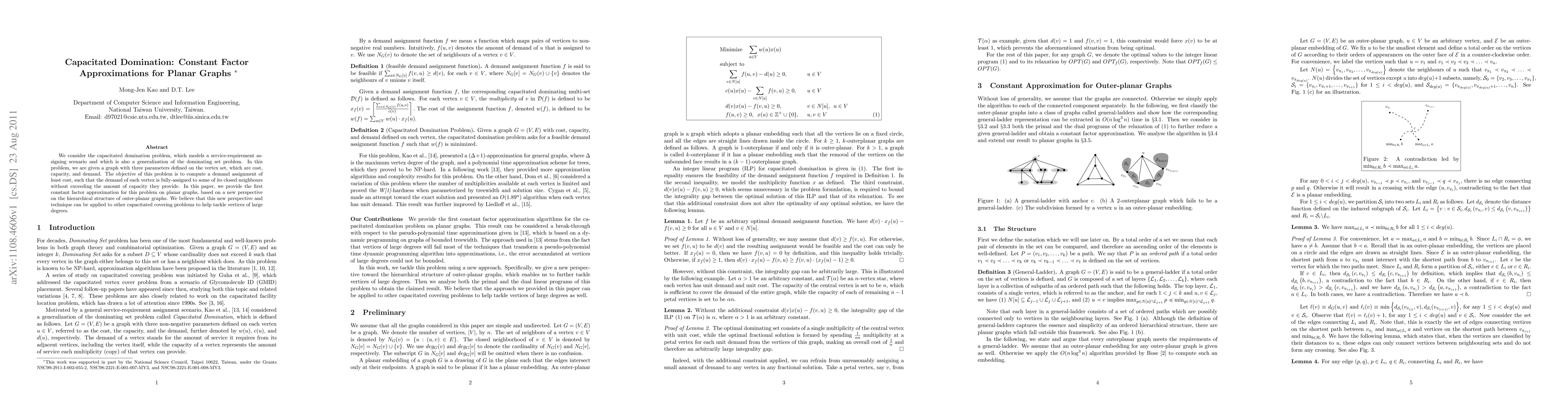 This paper presents the first constant factor approximation for the capacitated domination problem on planar graphs, utilizing a novel hierarchical approach based on the structure of outer-planar graphs. The method aims to minimize cost while ensuring each vertex's demand is met by its neighbors without exceeding their capacity.