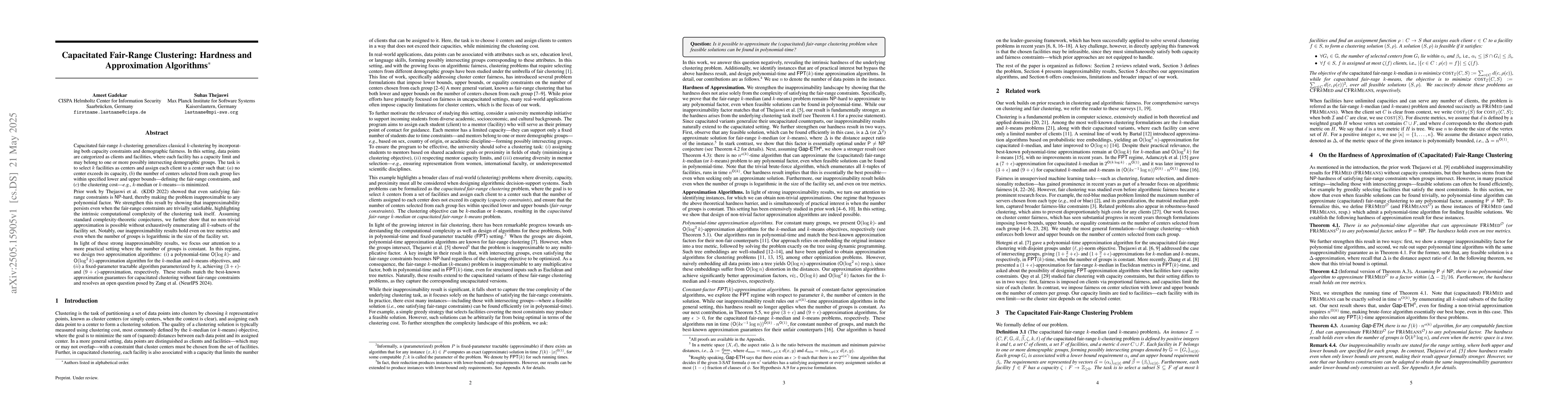 Research paper investigates capacitated fair-range clustering, a variant of k-clustering with capacity constraints and demographic fairness, showing strong inapproximability results and proposing approximation algorithms for practical settings.