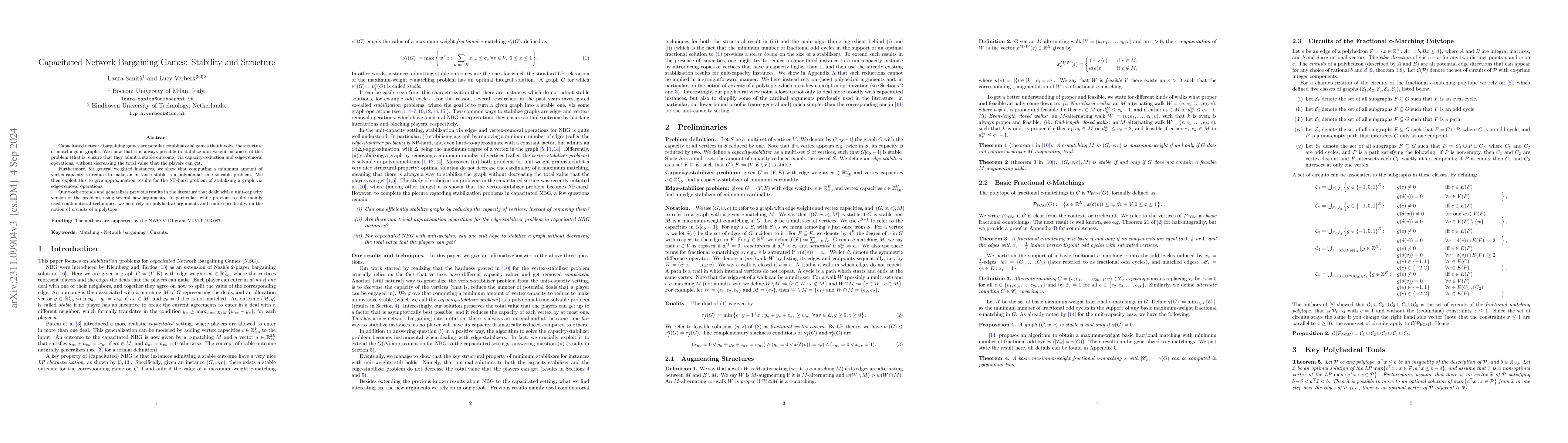 Capacitated network bargaining games are popular combinatorial games that involve the structure of matchings in graphs. We show that it is always possible to stabilize unit-weight instances of this problem (that is, ensure that they admit a stable outcome) via capacity-reduction and edge-removal operations, without decreasing the total value that the players can get. Furthermore, for general weighted instances, we show that computing a minimum amount of vertex-capacity to reduce to make an instance stable is a polynomial-time solvable problem. We then exploit this to give approximation results for the NP-hard problem of stabilizing a graph via edge-removal operations. Our work extends and generalizes previous results in the literature that dealt with a unit-capacity version of the problem, using several new arguments. In particular, while previous results mainly used combinatorial techniques, we here rely on polyhedral arguments and, more specifically, on the notion of circuits of a polytope.