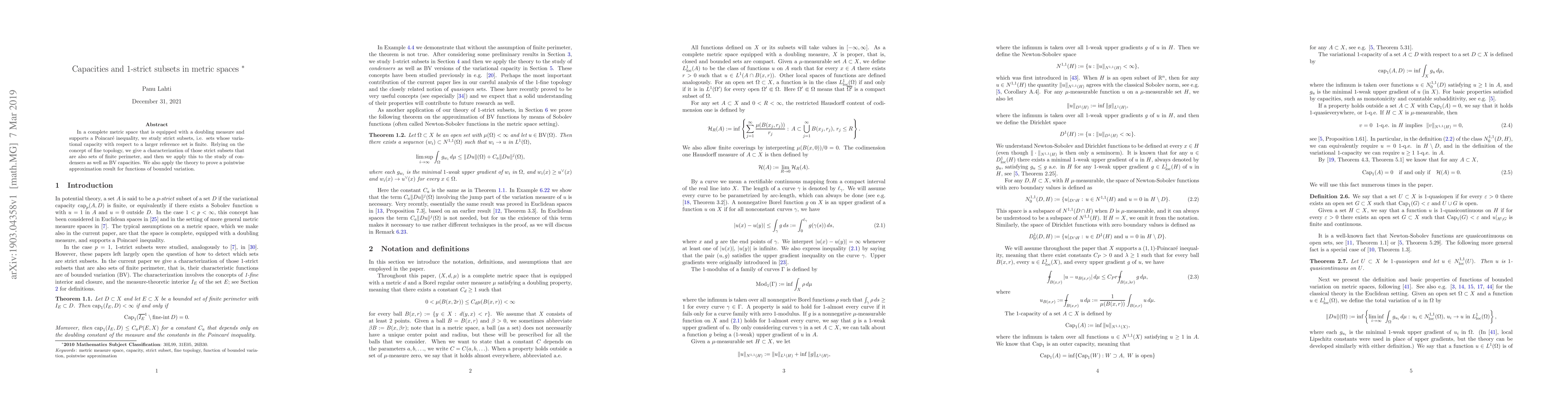 This research paper studies strict subsets in metric spaces with a focus on sets of finite perimeter and BV capacities, providing insights into condensers and pointwise approximation of functions.