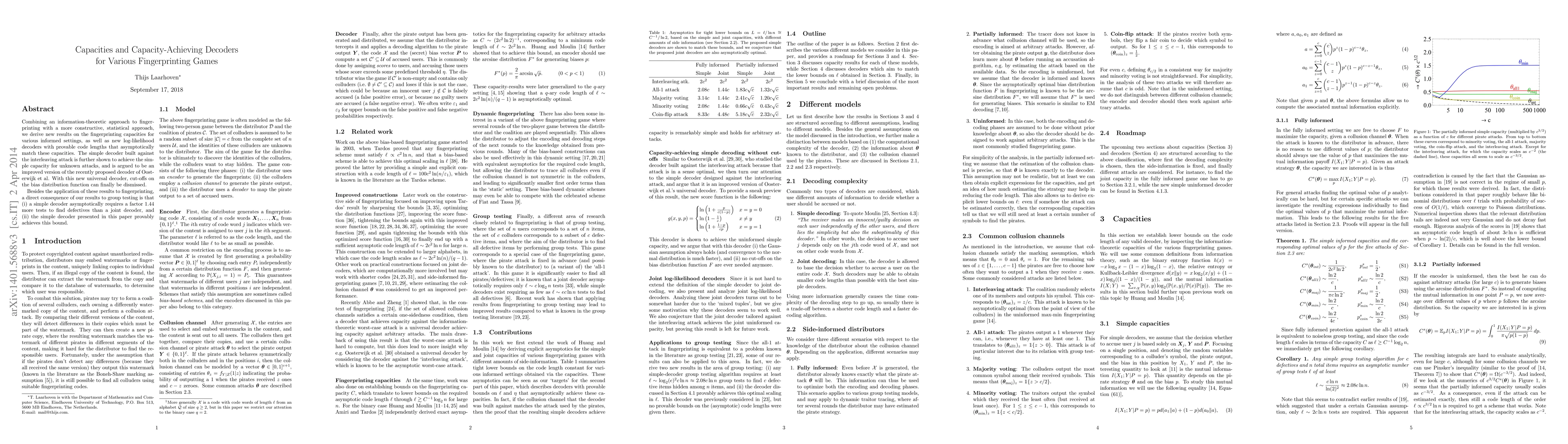 Combining an information-theoretic approach to fingerprinting with a more constructive, statistical approach, we derive new results on the fingerprinting capacities for various informed settings, as well as new log-likelihood decoders with provable code lengths that asymptotically match these capacities. The simple decoder built against the interleaving attack is further shown to achieve the simple capacity for unknown attacks, and is argued to be an improved version of the recently proposed decoder of Oosterwijk et al. With this new universal decoder, cut-offs on the bias distribution function can finally be dismissed. Besides the application of these results to fingerprinting, a direct consequence of our results to group testing is that (i) a simple decoder asymptotically requires a factor 1.44 more tests to find defectives than a joint decoder, and (ii) the simple decoder presented in this paper provably achieves this bound.