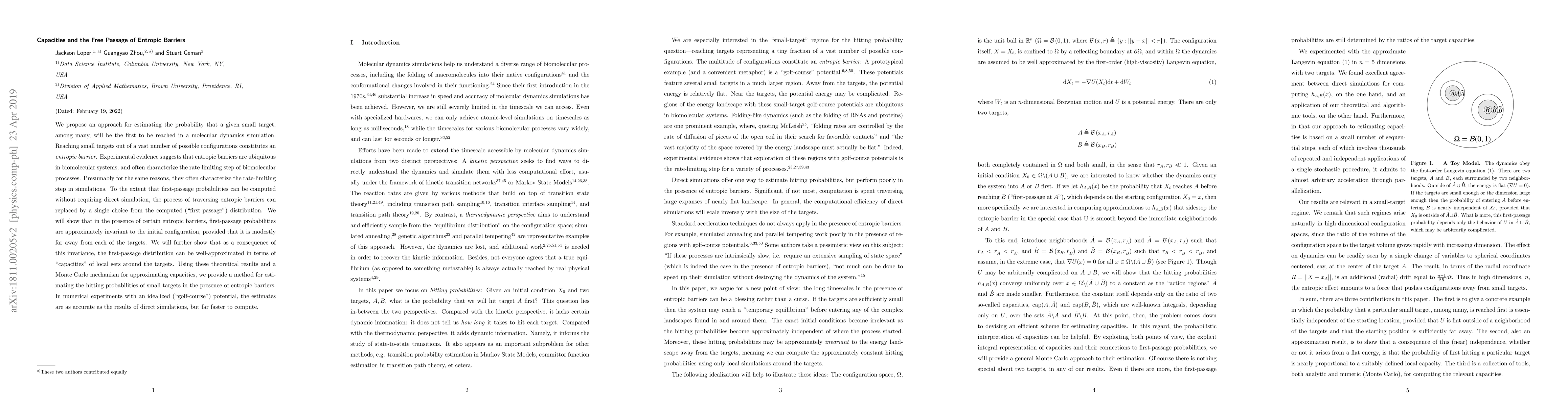We propose an approach for estimating the probability that a given small target, among many, will be the first to be reached in a molecular dynamics simulation. Reaching small targets out of a vast number of possible configurations constitutes an entropic barrier. Experimental evidence suggests that entropic barriers are ubiquitous in biomolecular systems, and often characterize the rate-limiting step of biomolecular processes. Presumably for the same reasons, they often characterize the rate-limiting step in simulations. To the extent that first-passage probabilities can be computed without requiring direct simulation, the process of traversing entropic barriers can replaced by a single choice from the computed ("first-passage") distribution. We will show that in the presence of certain entropic barriers, first-passage probabilities are approximately invariant to the initial configuration, provided that it is modestly far away from each of the targets. We will further show that as a consequence of this invariance, the first-passage distribution can be well-approximated in terms of "capacities" of local sets around the targets. Using these theoretical results and a Monte Carlo mechanism for approximating capacities, we provide a method for estimating the hitting probabilities of small targets in the presence of entropic barriers. In numerical experiments with an idealized ("golf-course") potential, the estimates are as accurate as the results of direct simulations, but far faster to compute.