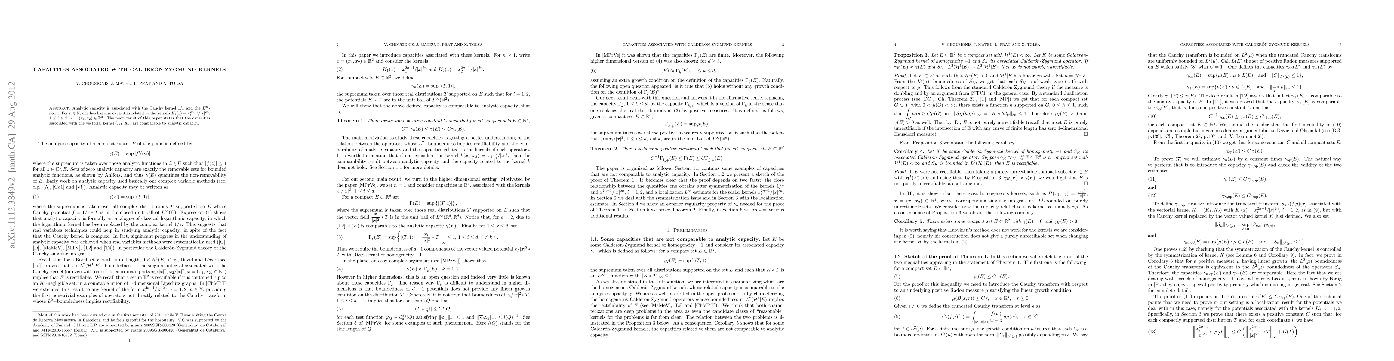 Analytic capacity is related to capacities associated with Calder\u2013Zygmund kernels in 2D space, including the Cauchy kernel and vectorial kernels $(K_1, K_2)$. Capacities of these kernels are comparable to analytic capacity.