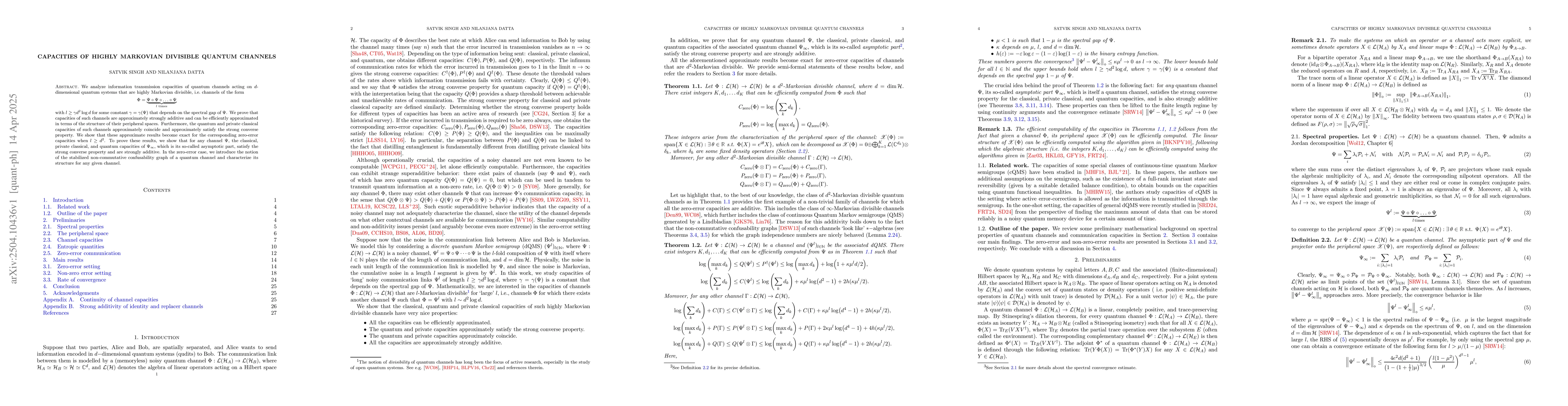 The paper proves properties of capacities for highly Markovian divisible quantum channels, linking them to the structure of peripheral spaces and introducing the stabilized non-commutative confusability graph for zero-error capacities.