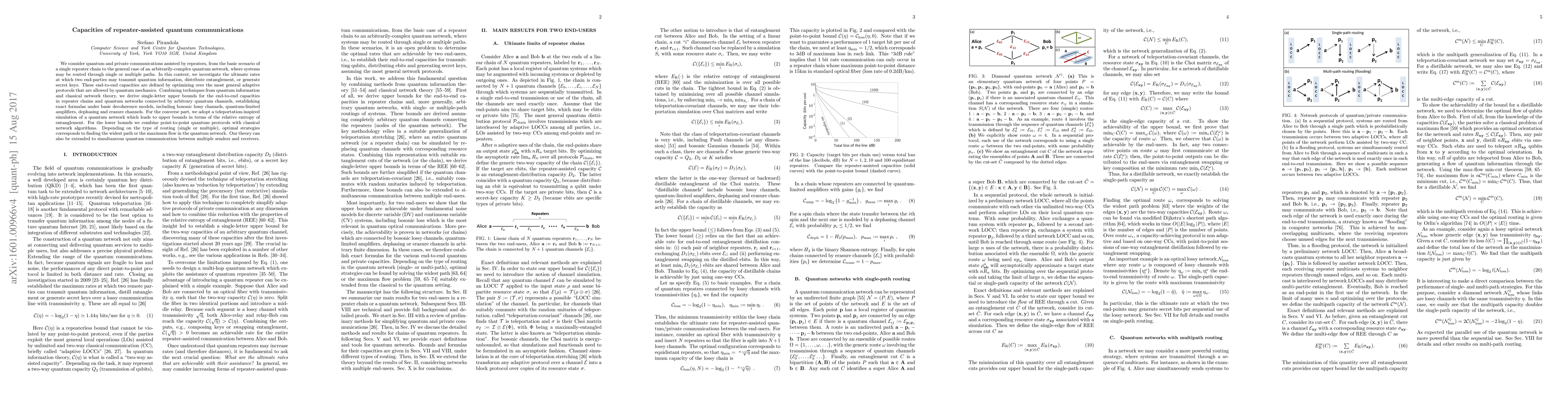 This paper investigates the capacities of quantum communications enhanced by repeaters, deriving upper bounds for end-to-end quantum information transmission, entanglement distribution, and secret key generation in complex quantum networks. It combines quantum information and classical network theory to establish exact formulas for various decoherence models.