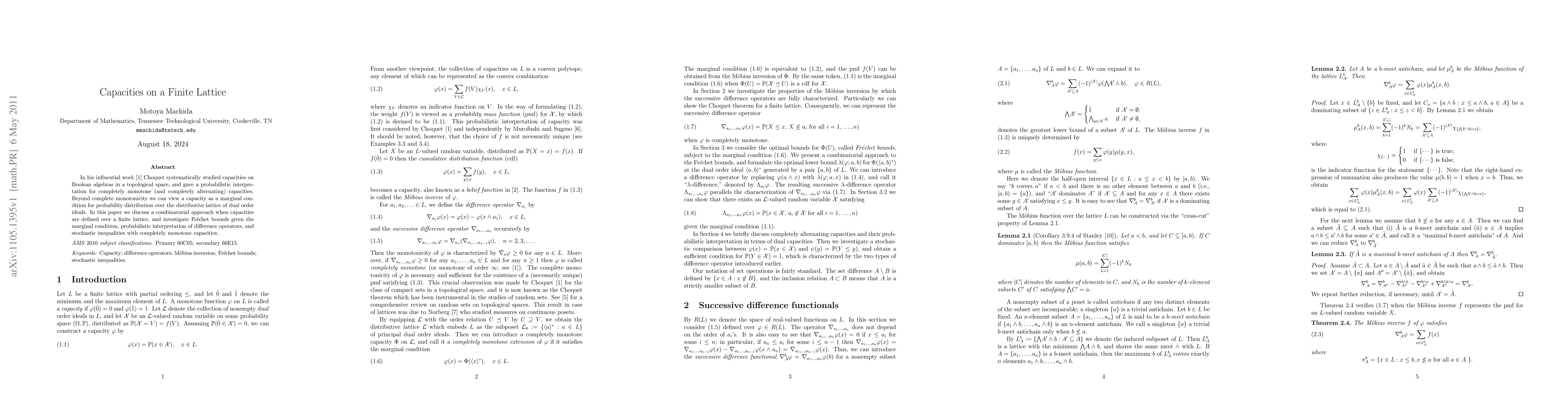 The paper presents a combinatorial approach to capacities on finite lattices, introducing Fréchet bounds, probabilistic interpretations, and stochastic inequalities with completely monotone capacities.