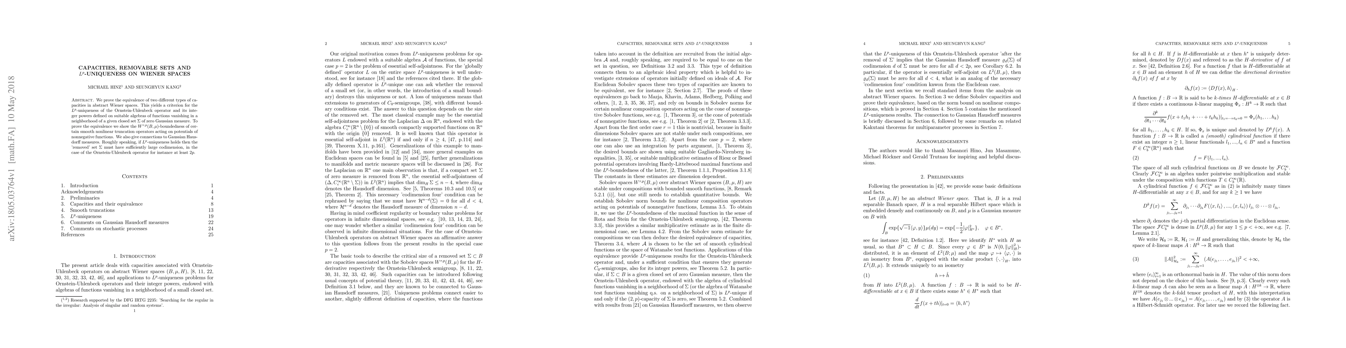 This research paper proves the equivalence of two capacities in abstract Wiener spaces, leading to a criterion for the L^p-uniqueness of the Ornstein-Uhlenbeck operator, and provides connections to Gaussian Hausdorff measures.