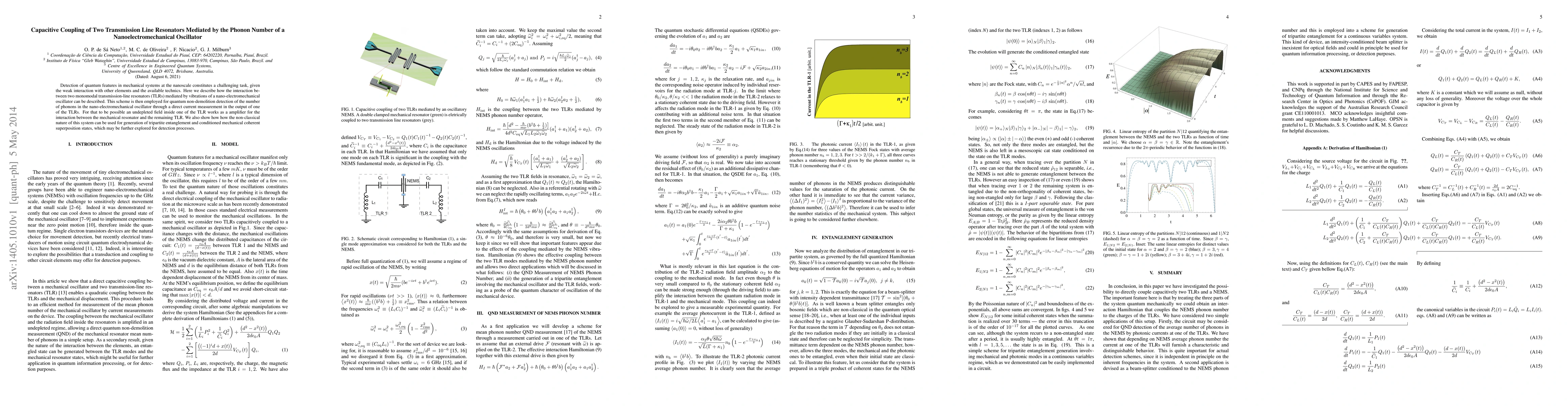 Detection of quantum features in mechanical systems at the nanoscale constitutes a challenging task, given the weak interaction with other elements and the available technics. Here we describe how the interaction between two monomodal transmission-line resonators (TLRs) mediated by vibrations of a nano-electromechanical oscillator can be described. This scheme is then employed for quantum non-demolition detection of the number of phonons in the nano-electromechanical oscillator through a direct current measurement in the output of one of the TLRs. For that to be possible an undepleted field inside one of the TLR works as a amplifier for the interaction between the mechanical resonator and the remaining TLR. We also show how how the non-classical nature of this system can be used for generation of tripartite entanglement and conditioned mechanical coherent superposition states, which may be further explored for detection processes.