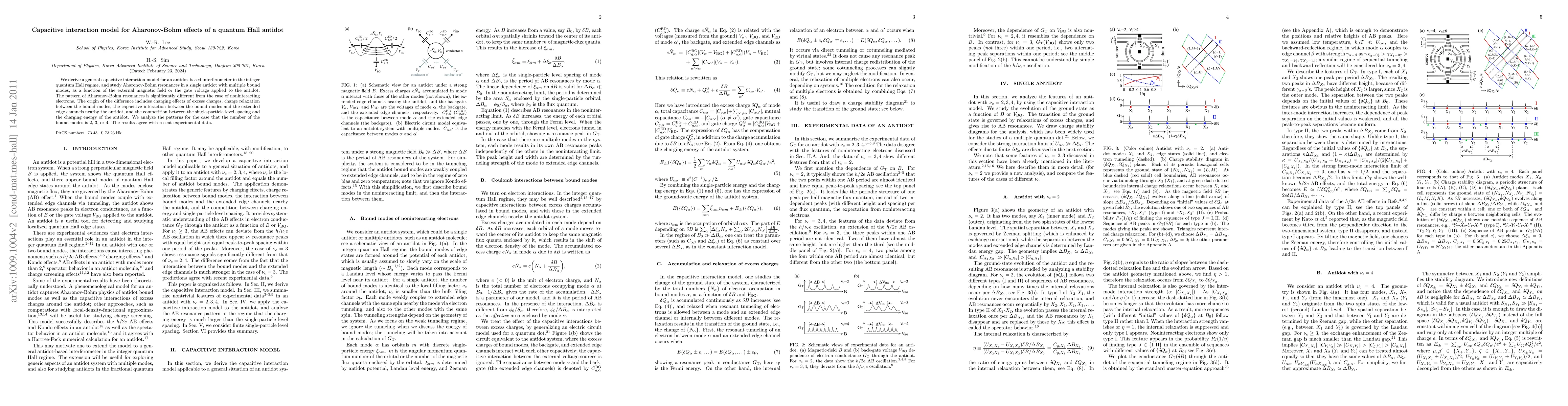 This paper develops a capacitive interaction model for an antidot-based interferometer in the integer quantum Hall regime, revealing distinct Aharonov-Bohm resonance patterns due to charging effects, charge relaxation, and capacitive interactions, which differ from noninteracting electron models. The study aligns with recent experimental observations.