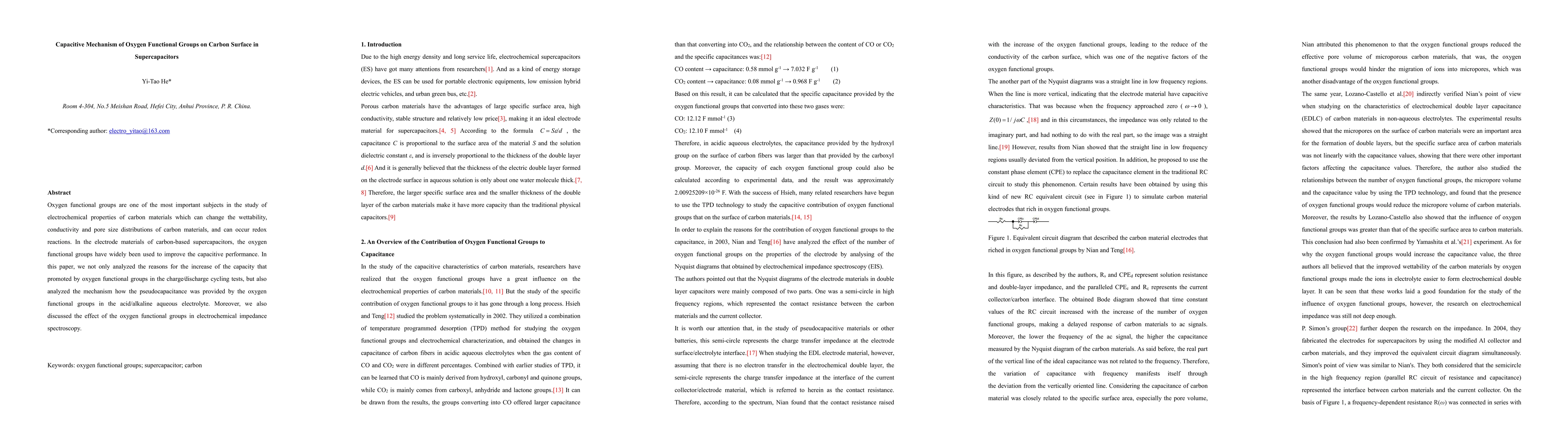 This paper investigates how oxygen functional groups enhance the capacitive performance of carbon-based supercapacitors by analyzing their impact on charge-discharge cycling and the pseudocapacitance mechanism in acid/alkaline electrolytes, as well as their role in electrochemical impedance spectroscopy.