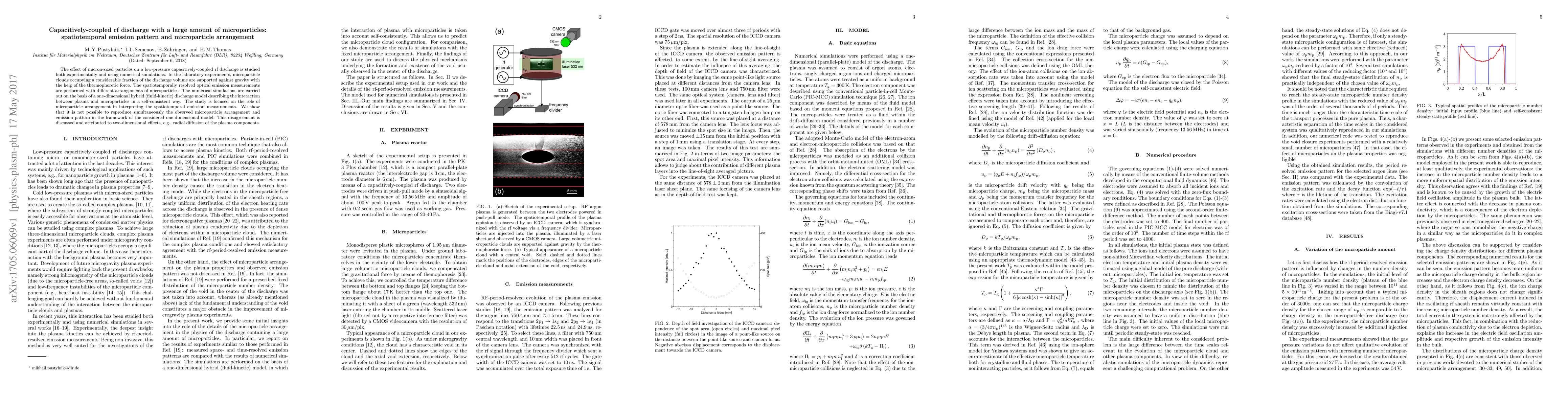 This study investigates the influence of micron-sized particles on low-pressure capacitively-coupled rf discharges through experiments and numerical simulations. The results show that the one-dimensional model fails to reproduce the observed microparticle arrangement and emission pattern, suggesting the need for two-dimensional effects like radial plasma diffusion.