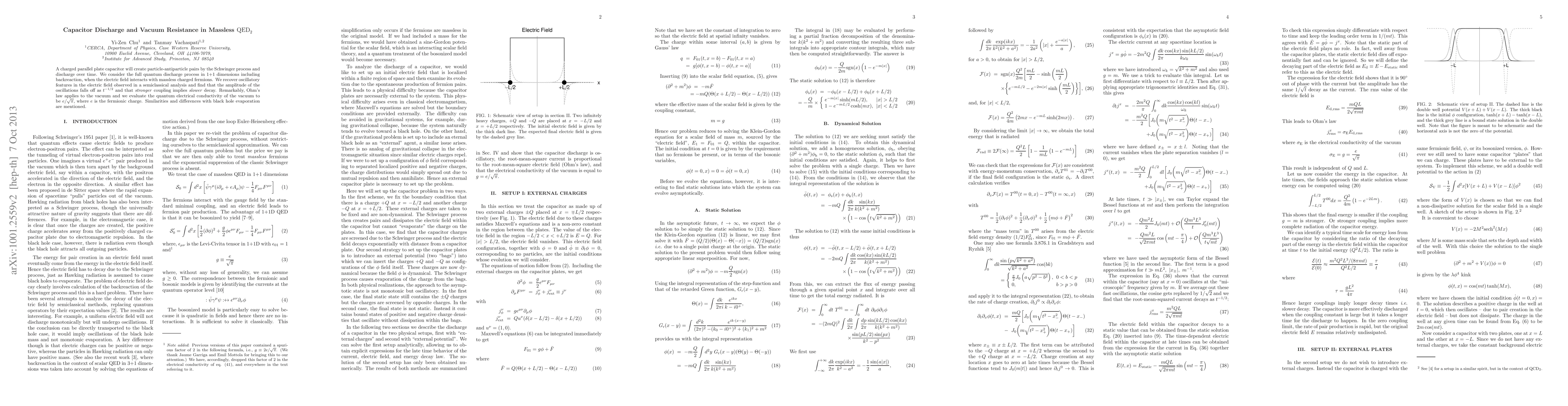 This paper investigates the quantum discharge of a charged parallel plate capacitor in 1+1 dimensions, revealing oscillatory electric field behavior and a decay rate proportional to t^{-1/2}. It finds that the vacuum behaves according to Ohm's law, with a calculated quantum electrical conductivity of e/\pi^{1/2}, and draws parallels to black hole evaporation.