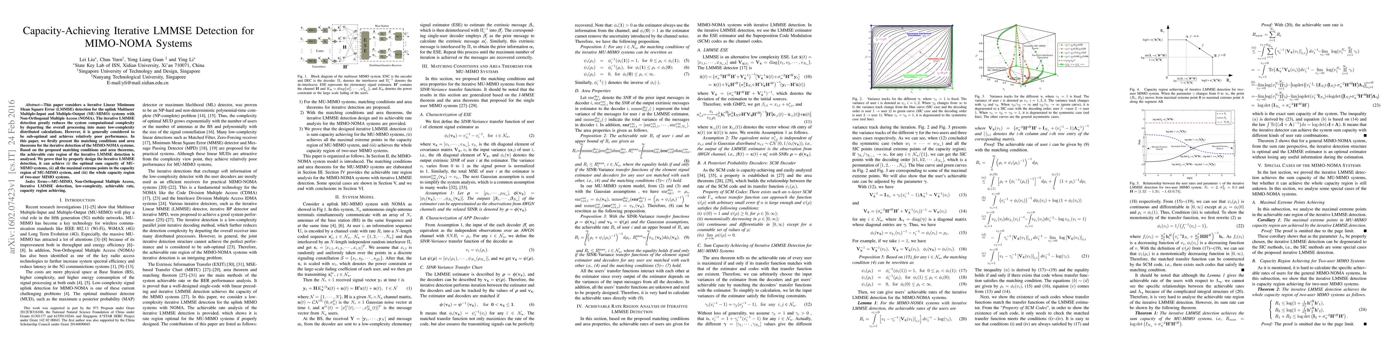 This paper explores an iterative LMMSE detection method for MIMO-NOMA systems, demonstrating its capacity-achieving potential through matching conditions and area theorems. It proves that the proposed iterative LMMSE detection can achieve optimal sum capacity, all maximal extreme points, and the entire capacity region for two-user MIMO systems.