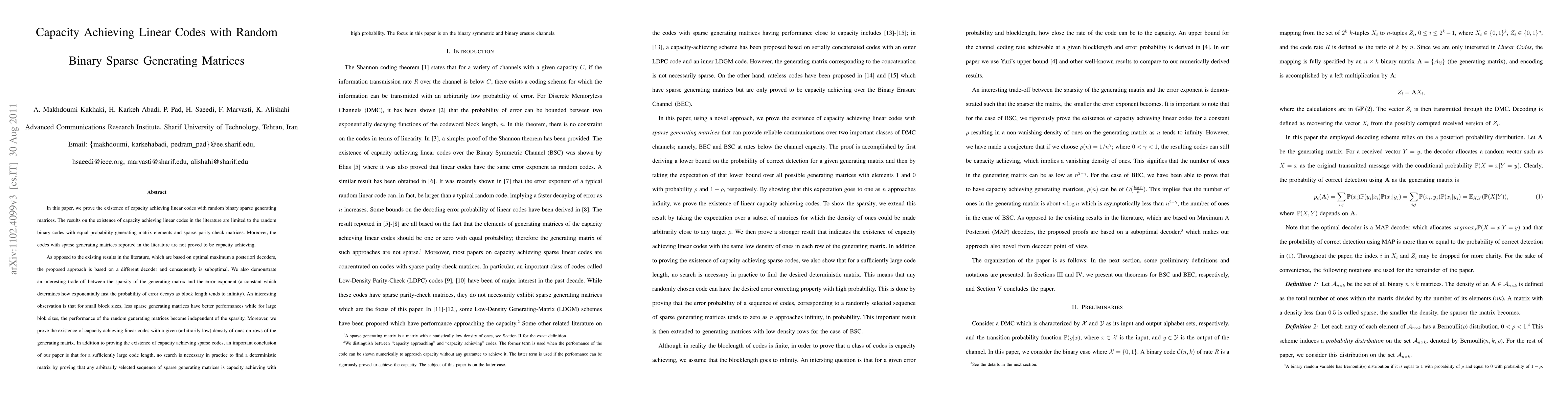 This paper establishes the existence of capacity achieving linear codes with random binary sparse generating matrices, addressing limitations in prior research. It demonstrates a trade-off between generating matrix sparsity and error exponent, showing that less sparse matrices perform better for small block sizes but become independent of sparsity for large sizes. Importantly, the authors prove that for sufficiently large code lengths, any arbitrarily chosen sparse generating matrix is likely to achieve capacity without the need for specific search strategies.