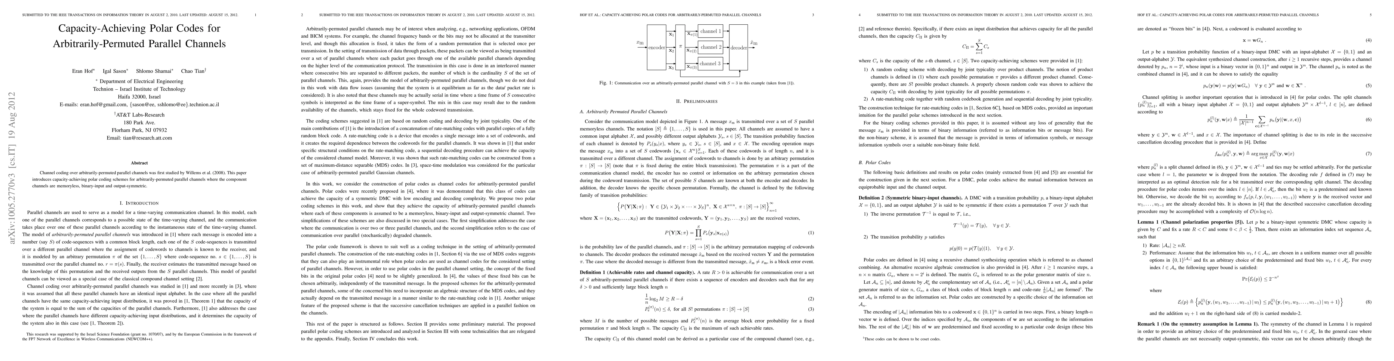 Summary: This paper presents capacity-achieving polar coding schemes for memoryless, binary-input, and output-symmetric arbitrarily-permuted parallel channels, building on the foundational work by Willems et al. (2008). The proposed schemes aim to optimize channel coding efficiency in such complex channel configurations.