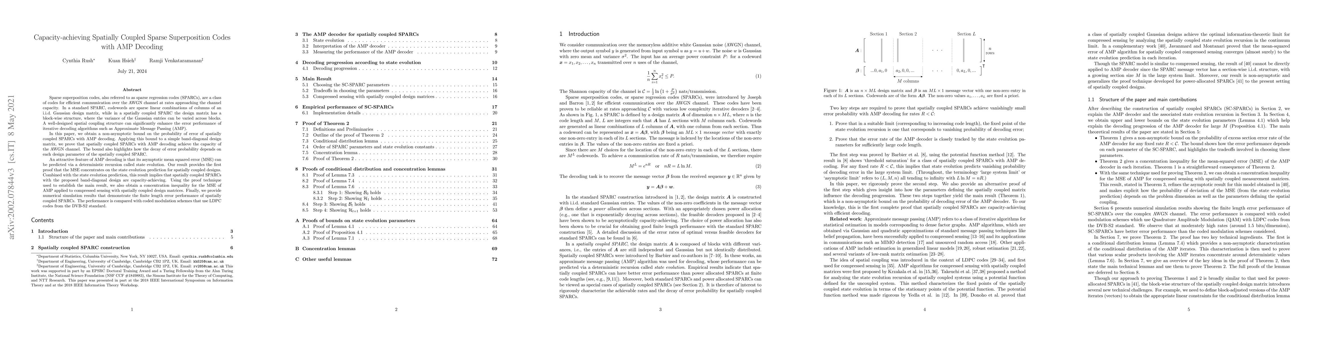 This paper investigates spatially coupled sparse superposition codes (SPARCs) for efficient communication over the AWGN channel, proving that these codes achieve the channel capacity with AMP decoding. It provides a non-asymptotic error probability bound and demonstrates that the asymptotic mean squared error aligns with state evolution predictions, confirming the capacity-achieving nature of the proposed band-diagonal design.