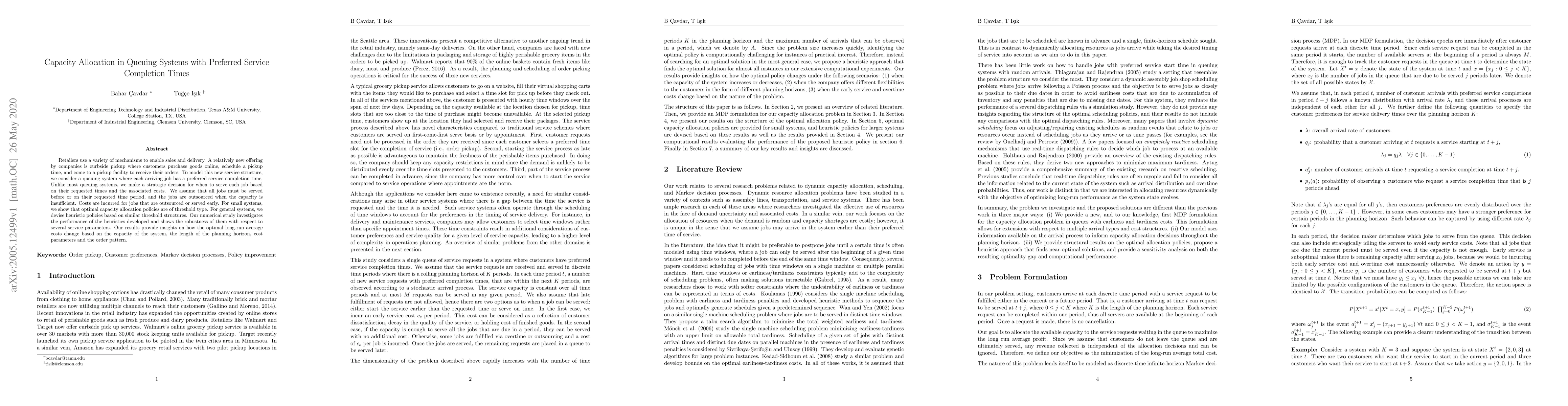 Retailers use a variety of mechanisms to enable sales and delivery. A relatively new offering by companies is curbside pickup where customers purchase goods online, schedule a pickup time, and come to a pickup facility to receive their orders. To model this new service structure, we consider a queuing system where each arriving job has a preferred service completion time. Unlike most queuing systems, we make a strategic decision for when to serve each job based on their requested times and the associated costs. We assume that all jobs must be served before or on their requested time period, and the jobs are outsourced when the capacity is insufficient. Costs are incurred for jobs that are outsourced or served early. For small systems, we show that optimal capacity allocation policies are of threshold type. For general systems, we devise heuristic policies based on similar threshold structures. Our numerical study investigates the performance of the heuristics developed and shows the robustness of them with respect to several service parameters. Our results provide insights on how the optimal long-run average costs change based on the capacity of the system, the length of the planning horizon, cost parameters and the order pattern.