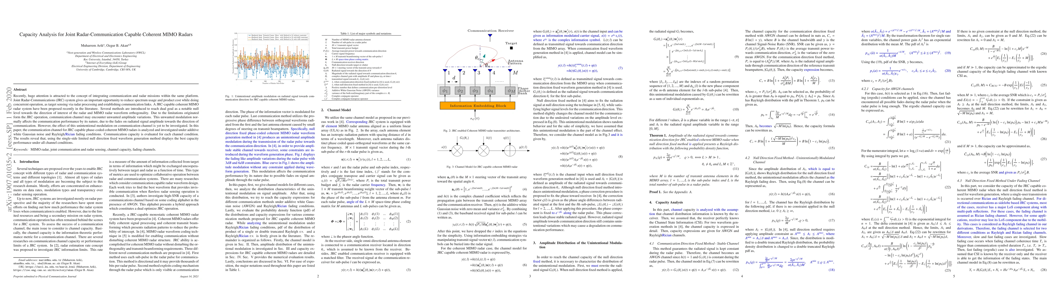 This paper analyzes the communication channel for joint radar-communication capable phase-coded coherent MIMO radars under various fading conditions, evaluating communication capacity. The study finds that the single-side limited null direction fixed waveform generation method offers the best capacity performance across all conditions.