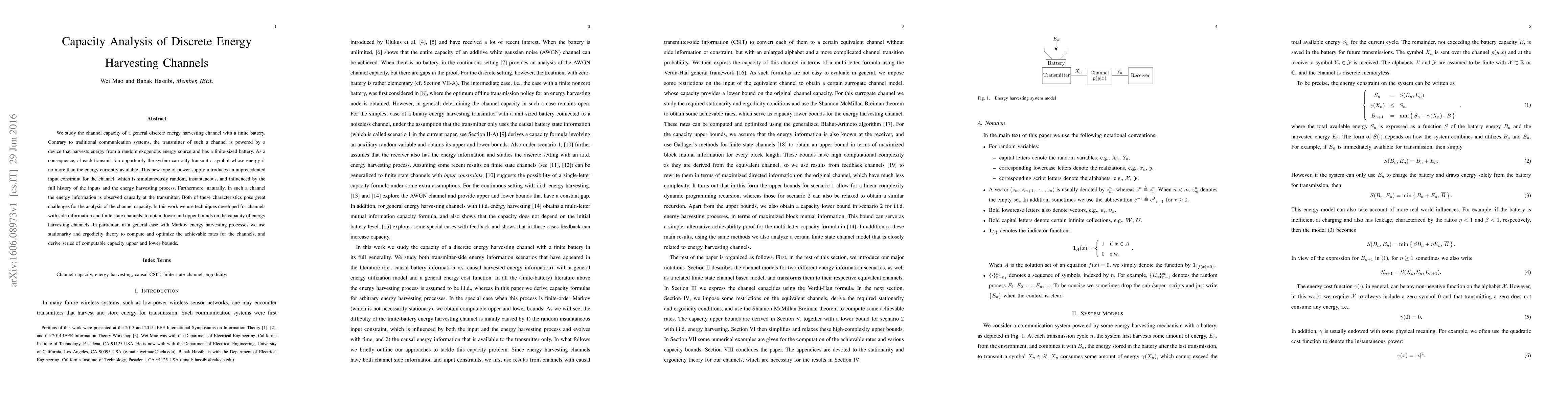 We study the channel capacity of a general discrete energy harvesting channel with a finite battery. Contrary to traditional communication systems, the transmitter of such a channel is powered by a device that harvests energy from a random exogenous energy source and has a finite-sized battery. As a consequence, at each transmission opportunity the system can only transmit a symbol whose energy is no more than the energy currently available. This new type of power supply introduces an unprecedented input constraint for the channel, which is simultaneously random, instantaneous, and influenced by the full history of the inputs and the energy harvesting process. Furthermore, naturally, in such a channel the energy information is observed causally at the transmitter. Both of these characteristics pose great challenges for the analysis of the channel capacity. In this work we use techniques developed for channels with side information and finite state channels, to obtain lower and upper bounds on the capacity of energy harvesting channels. In particular, in a general case with Markov energy harvesting processes we use stationarity and ergodicity theory to compute and optimize the achievable rates for the channels, and derive series of computable capacity upper and lower bounds.