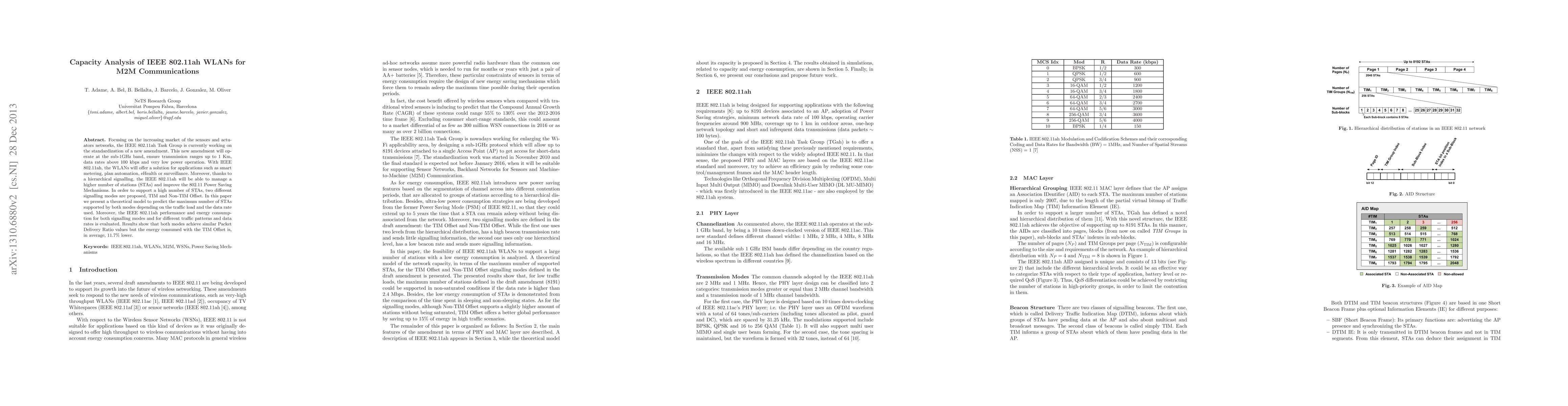 This paper analyzes the capacity of IEEE 802.11ah WLANs for Machine-to-Machine (M2M) communications, presenting a theoretical model to predict the maximum number of supported stations under different traffic loads and data rates. Results indicate similar performance but lower energy consumption for TIM Offset mode by 11.7% on average.