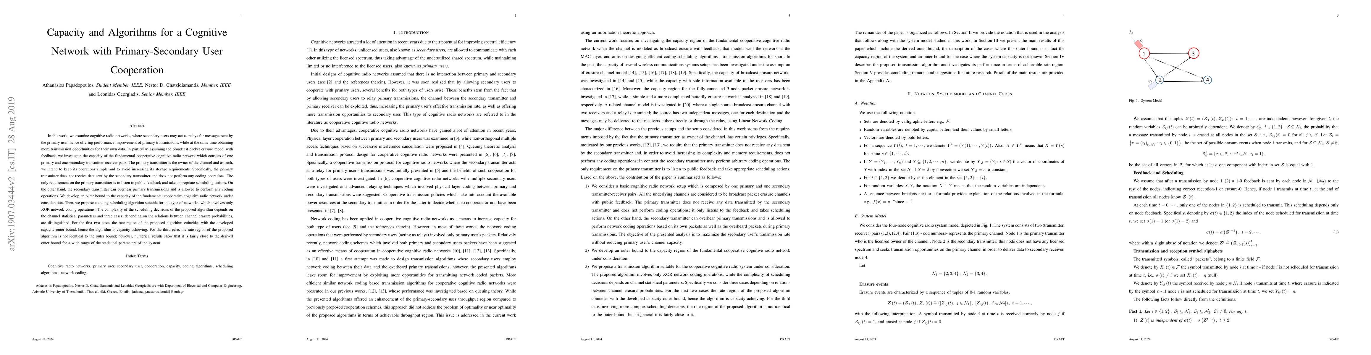 This paper investigates the capacity and algorithms for a cooperative cognitive radio network where secondary users act as relays for primary users, enhancing primary transmission performance while gaining more transmission opportunities. The authors develop an outer bound to the network's capacity and propose a coding-scheduling algorithm based on XOR network coding, which achieves capacity for two out of three channel conditions, and is close to capacity for the third.