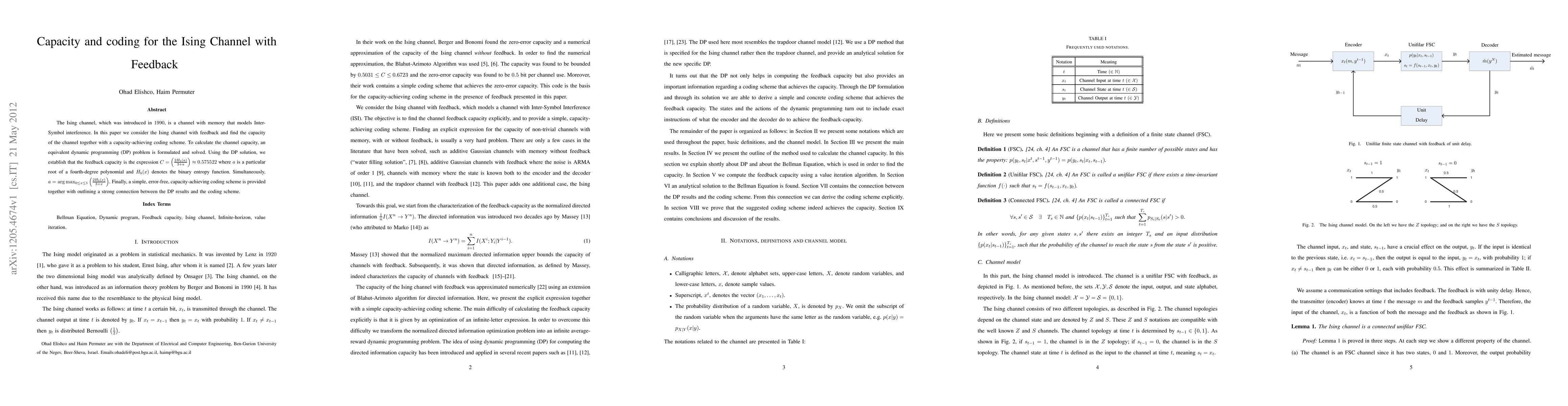 This paper determines the capacity of the Ising channel with feedback, finding it to be $C=(\frac{2H_b(a)}{3+a})$, where $a$ is a root of a specific polynomial. It also presents a capacity-achieving coding scheme and links the dynamic programming solution to the coding strategy.