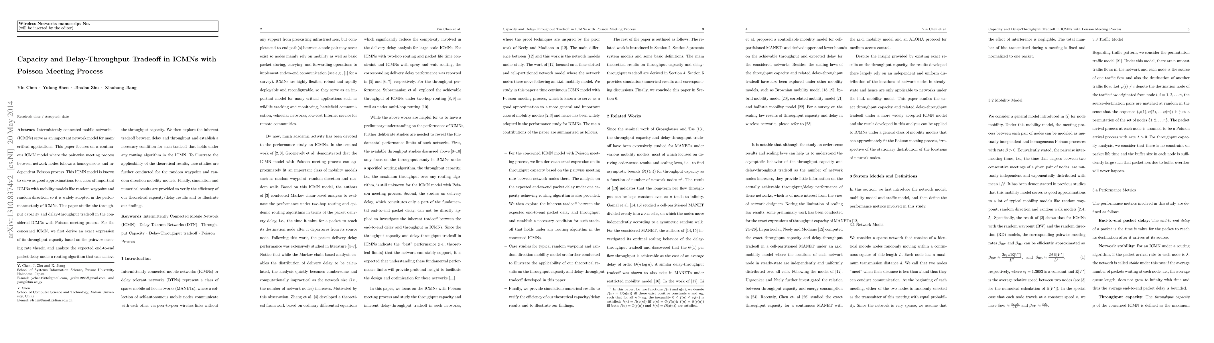 This paper investigates the throughput capacity and delay-throughput tradeoff in intermittently connected mobile networks (ICMNs) where node meetings follow a Poisson process. It derives an exact expression for throughput capacity and analyzes packet delay, establishing a necessary condition for the delay-throughput tradeoff applicable to any routing algorithm in ICMNs.