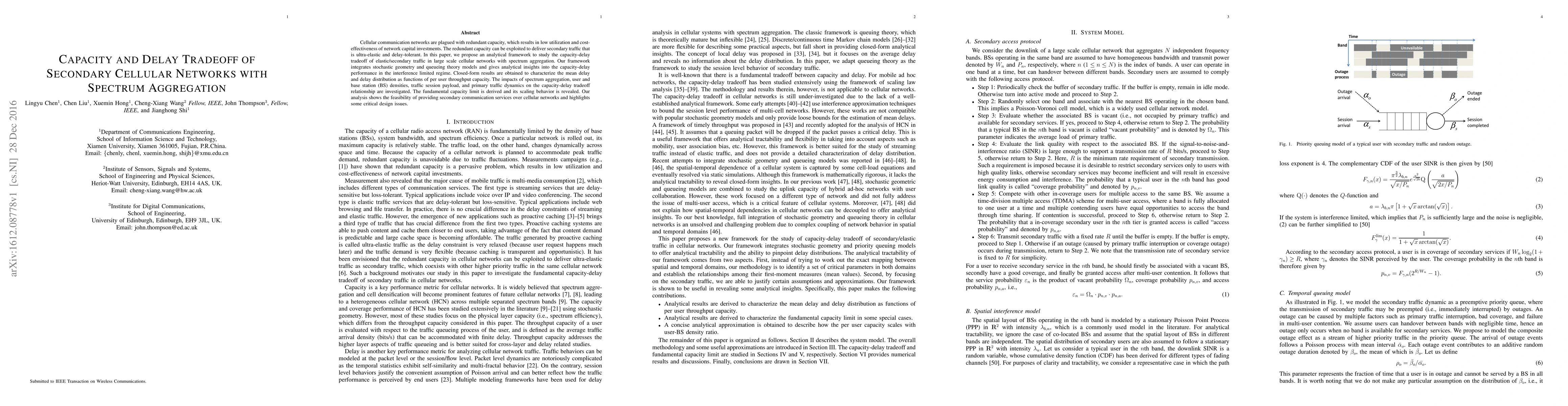 This paper proposes an analytical framework to study the capacity-delay tradeoff in cellular networks utilizing spectrum aggregation for secondary traffic. It integrates stochastic geometry and queueing theory to derive closed-form results on mean delay and delay distribution, revealing the impacts of various factors on the tradeoff and highlighting the feasibility of secondary communication services.
