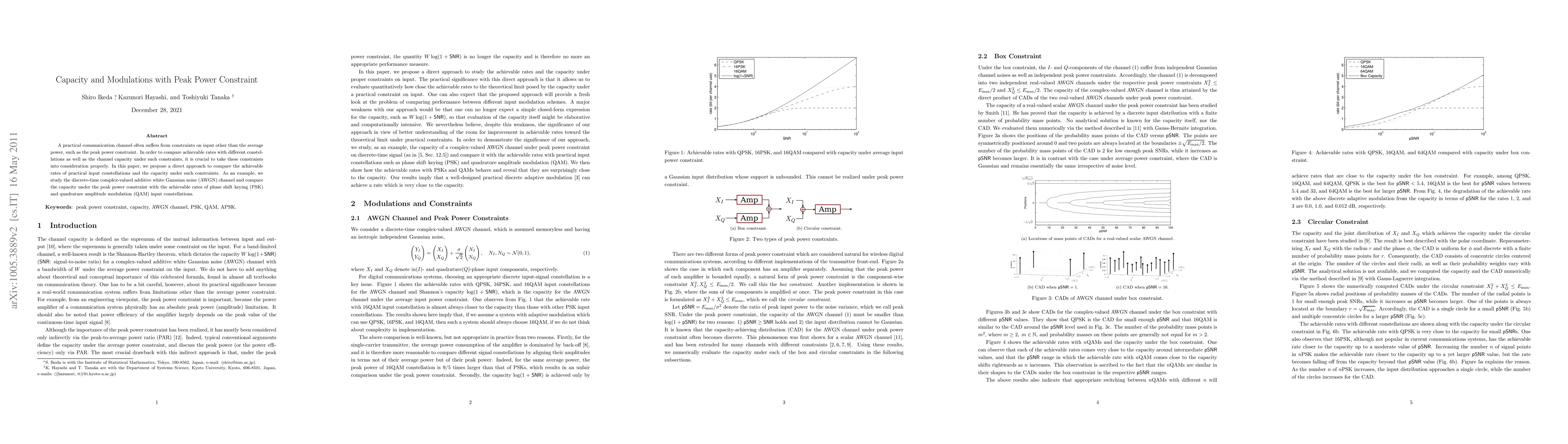 A practical communication channel often suffers from constraints on input other than the average power, such as the peak power constraint. In order to compare achievable rates with different constellations as well as the channel capacity under such constraints, it is crucial to take these constraints into consideration properly. In this paper, we propose a direct approach to compare the achievable rates of practical input constellations and the capacity under such constraints. As an example, we study the discrete-time complex-valued additive white Gaussian noise (AWGN) channel and compare the capacity under the peak power constraint with the achievable rates of phase shift keying (PSK) and quadrature amplitude modulation (QAM) input constellations.