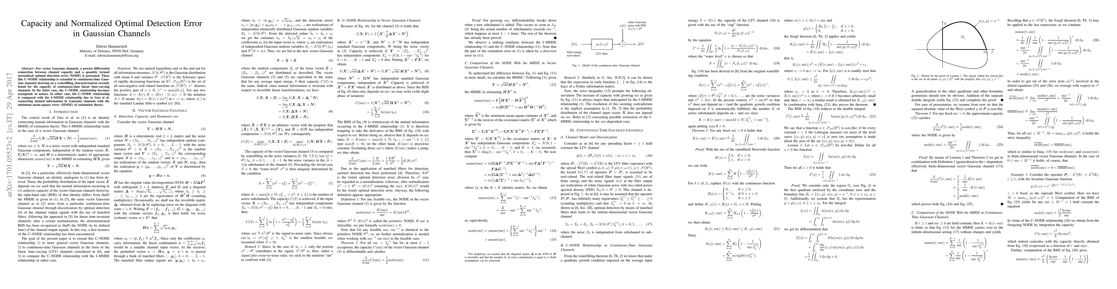This paper establishes a precise differential relationship between channel capacity and normalized optimal detection error (NODE) in vector Gaussian channels, extending this relationship to continuous-time Gaussian channels using a waterfilling approach. The findings are compared with the I-MMSE relationship, highlighting differences in their implications for Gaussian channel performance.