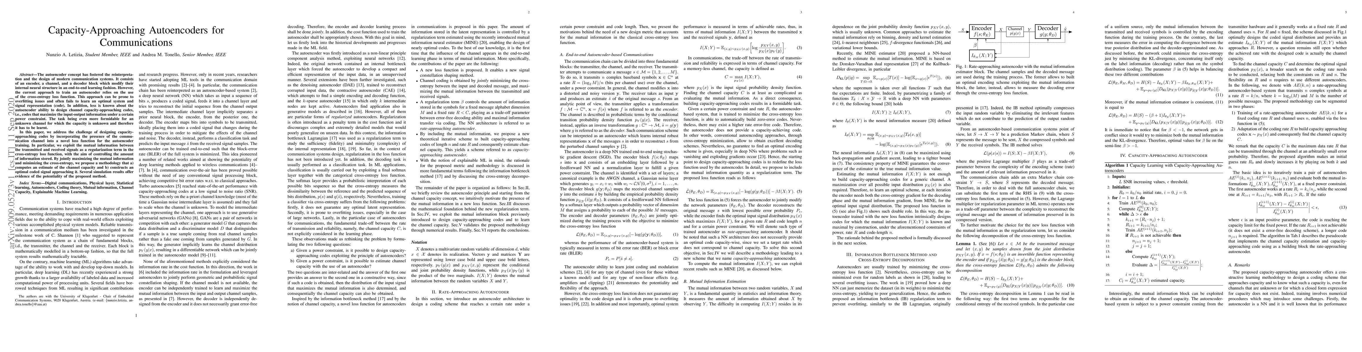 The autoencoder concept has fostered the reinterpretation and the design of modern communication systems. It consists of an encoder, a channel, and a decoder block which modify their internal neural structure in an end-to-end learning fashion. However, the current approach to train an autoencoder relies on the use of the cross-entropy loss function. This approach can be prone to overfitting issues and often fails to learn an optimal system and signal representation (code). In addition, less is known about the autoencoder ability to design channel capacity-approaching codes, i.e., codes that maximize the input-output information under a certain power constraint. The task being even more formidable for an unknown channel for which the capacity is unknown and therefore it has to be learnt. In this paper, we address the challenge of designing capacity-approaching codes by incorporating the presence of the communication channel into a novel loss function for the autoencoder training. In particular, we exploit the mutual information between the transmitted and received signals as a regularization term in the cross-entropy loss function, with the aim of controlling the amount of information stored. By jointly maximizing the mutual information and minimizing the cross-entropy, we propose a methodology that a) computes an estimate of the channel capacity and b) constructs an optimal coded signal approaching it. Several simulation results offer evidence of the potentiality of the proposed method.