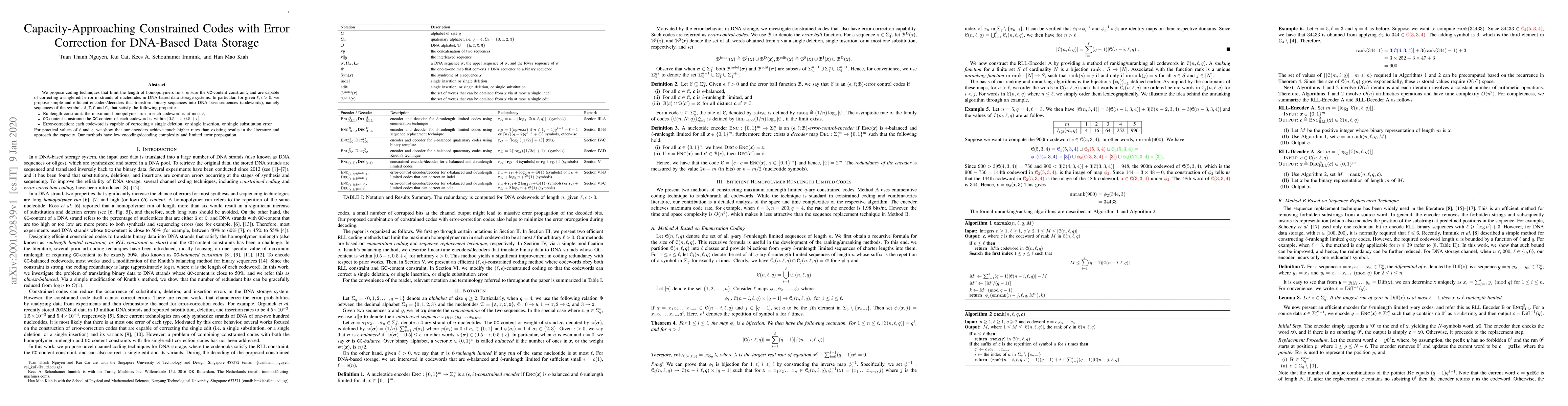 This paper proposes efficient coding techniques for DNA-based data storage that limit homopolymer run lengths and GC-content while correcting single edit errors. The proposed encoders/decoders achieve high storage rates and approach theoretical capacity limits with low complexity.