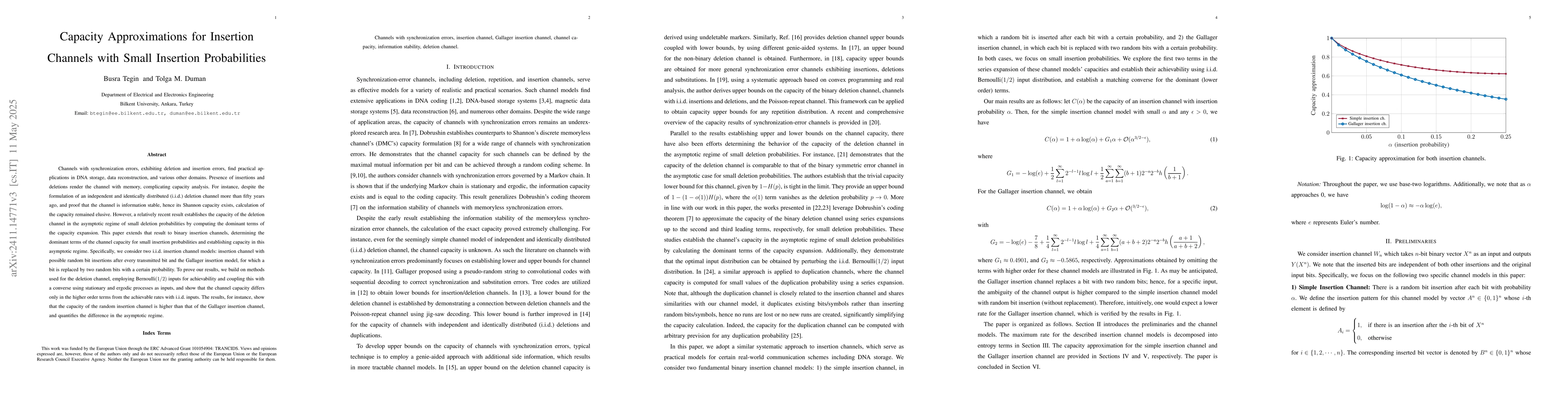 Channels with synchronization errors, exhibiting deletion and insertion errors, find practical applications in DNA storage, data reconstruction, and various other domains. Presence of insertions and deletions render the channel with memory, complicating capacity analysis. For instance, despite the formulation of an independent and identically distributed (i.i.d.) deletion channel more than fifty years ago, and proof that the channel is information stable, hence its Shannon capacity exists, calculation of the capacity remained elusive. However, a relatively recent result establishes the capacity of the deletion channel in the asymptotic regime of small deletion probabilities by computing the dominant terms of the capacity expansion. This paper extends that result to binary insertion channels, determining the dominant terms of the channel capacity for small insertion probabilities and establishing capacity in this asymptotic regime. Specifically, we consider two i.i.d. insertion channel models: insertion channel with possible random bit insertions after every transmitted bit and the Gallager insertion model, for which a bit is replaced by two random bits with a certain probability. To prove our results, we build on methods used for the deletion channel, employing Bernoulli(1/2) inputs for achievability and coupling this with a converse using stationary and ergodic processes as inputs, and show that the channel capacity differs only in the higher order terms from the achievable rates with i.i.d. inputs. The results, for instance, show that the capacity of the random insertion channel is higher than that of the Gallager insertion channel, and quantifies the difference in the asymptotic regime.