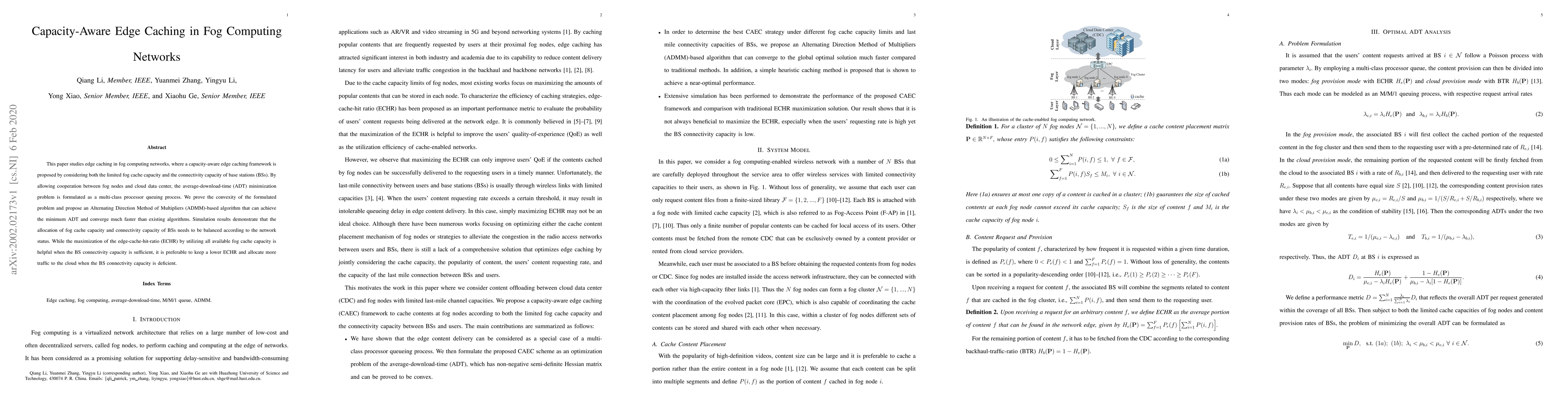 This paper proposes a capacity-aware edge caching framework for fog computing networks, balancing fog cache and base station connectivity capacities. An ADMM-based algorithm is developed to minimize average download time, demonstrating that optimal cache allocation depends on network status.