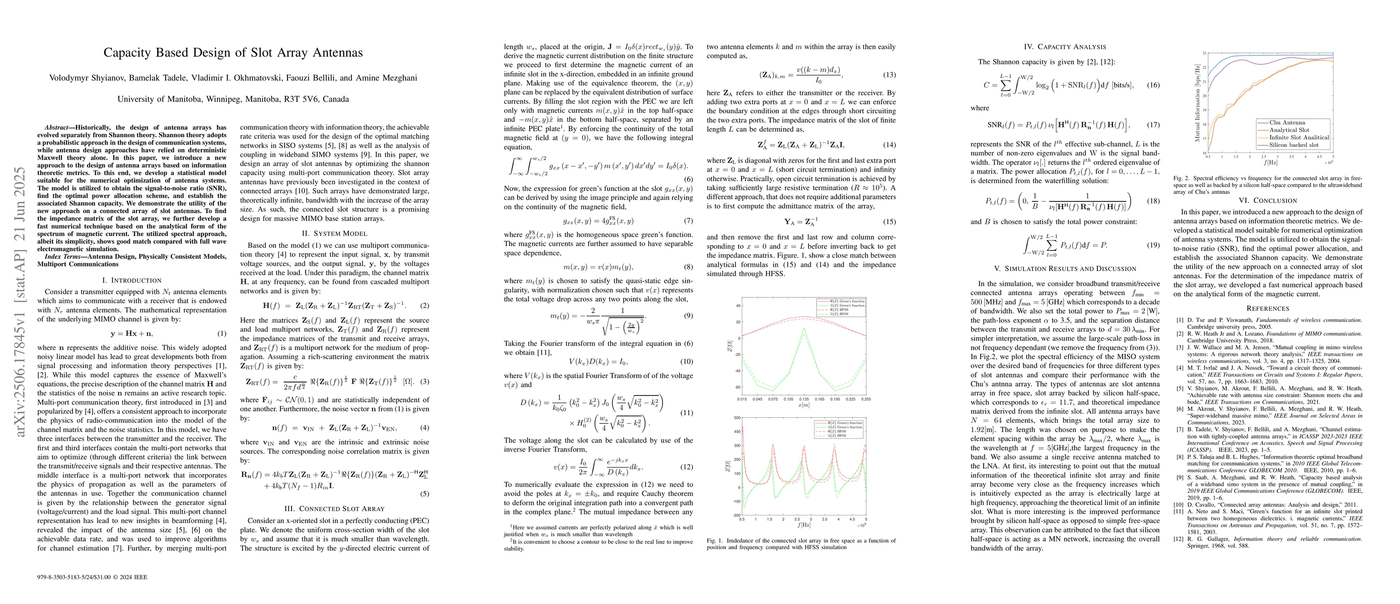 Historically, the design of antenna arrays has evolved separately from Shannon theory. Shannon theory adopts a probabilistic approach in the design of communication systems, while antenna design approaches have relied on deterministic Maxwell theory alone. In this paper, we introduce a new approach to the design of antenna arrays based on information theoretic metrics. To this end, we develop a statistical model suitable for the numerical optimization of antenna systems. The model is utilized to obtain the signal-to-noise ratio (SNR), find the optimal power allocation scheme, and establish the associated Shannon capacity. We demonstrate the utility of the new approach on a connected array of slot antennas. To find the impedance matrix of the slot array, we further develop a fast numerical technique based on the analytical form of the spectrum of magnetic current. The utilized spectral approach, albeit its simplicity, shows good match compared with full wave electromagnetic simulation.