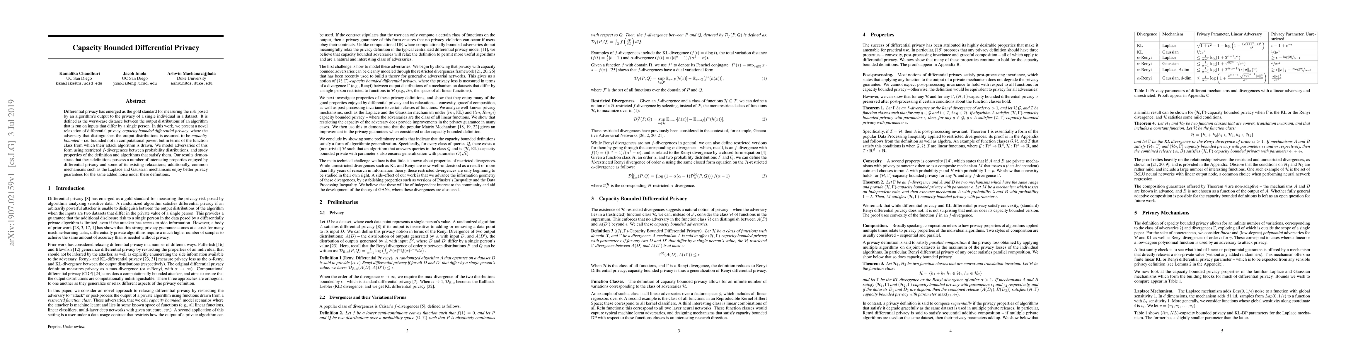This paper introduces a novel relaxation of differential privacy called capacity bounded differential privacy, where adversaries are constrained by the function class of their attack algorithms rather than computational power. The authors explore the properties and algorithms that satisfy this new definition using restricted f-divergences.